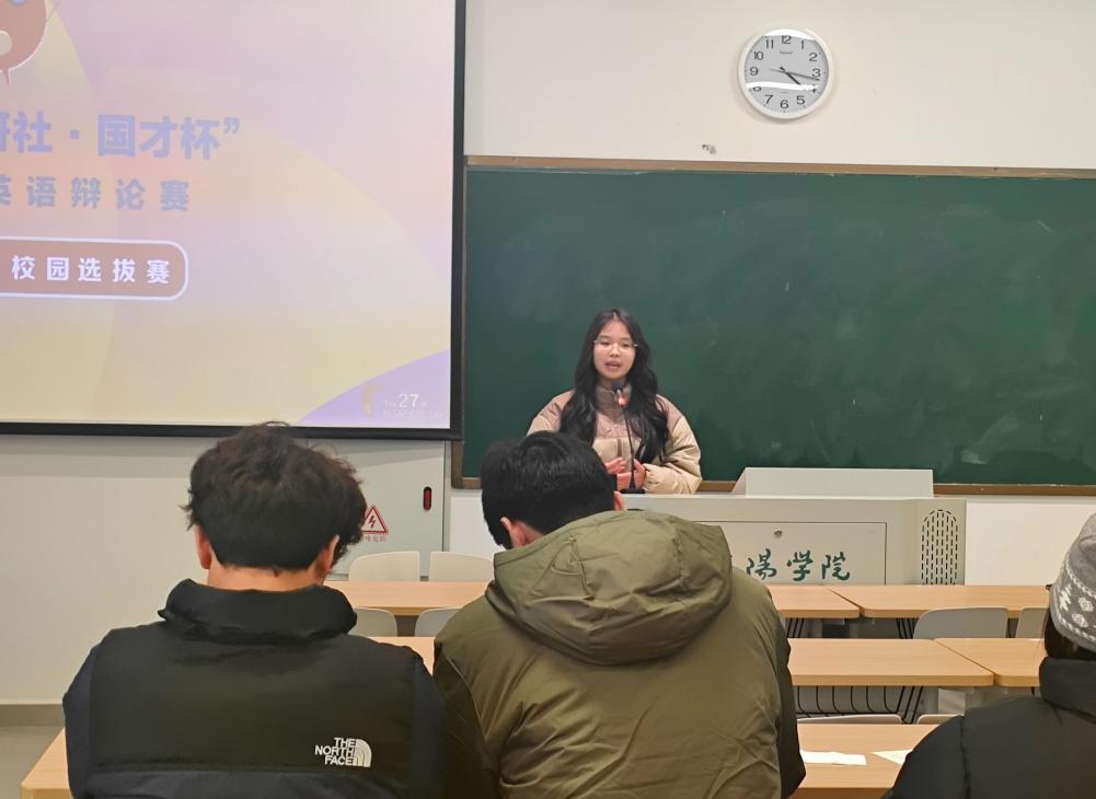 为全方位提高英语口语表达能力、思辨能力、跨文化交际能力、就业竞争力、国际传播力、全球胜任力,为广大英语爱好者精心构筑展示自我风采的优质平台,2025年3月4日,外国语学院悉心筹备的第二十七届国才杯英语辩论赛校选赛初赛(暨信阳学院第九届英语辩论赛)在教二楼410教室圆满落下帷幕。本次比赛由外语学科竞赛服务中心负责人董文静老师和余静老师全程指导,学院学术部精心组织,评委团由国才考试证书持有者和信阳学院第八届英语辩论赛优秀辩手(潘苏格、刘晶茹)、“国才杯”全国大学生外语能力大赛省级国家级获奖者(马靖然、沈晓宇)和往届国际青年文化交流项目优秀双语助教(李雨函、侯利伟)组成。