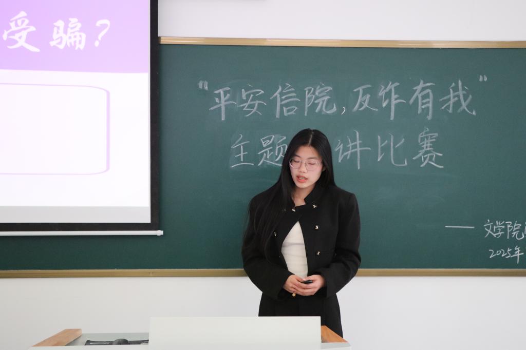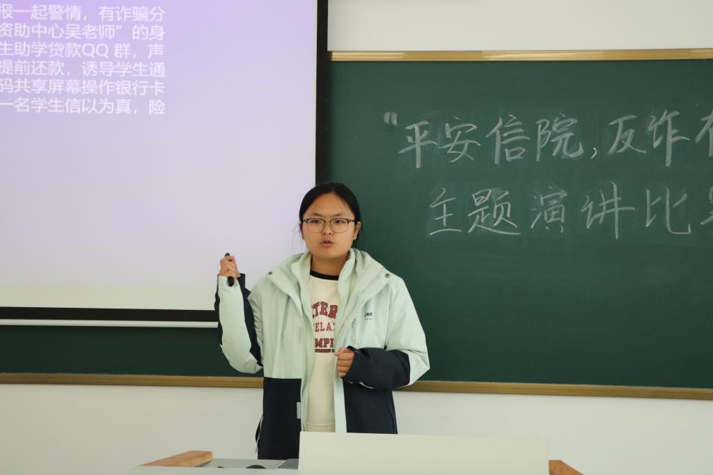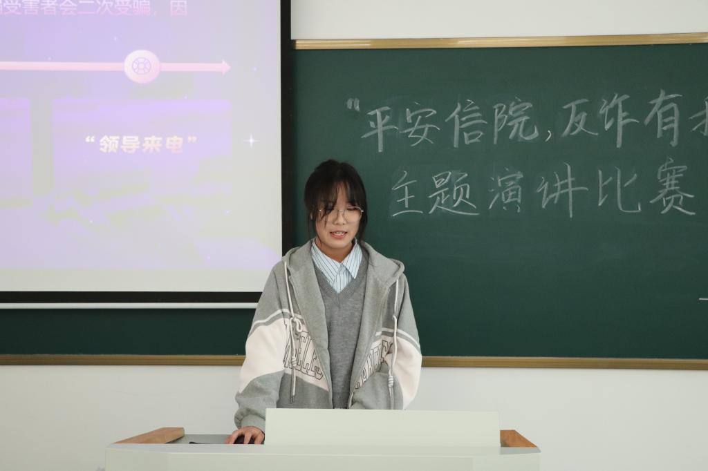 为进一步落实关于打击电信网络诈骗犯罪的重要内容,提升全校师生识骗、防骗的意识和能力,3月13日下午,我院于教一楼315、316教室举办“平安信院,反诈有我”校园反诈骗演讲比赛。本次比赛由杨欣杰、咸雅琪主持,辅导员湛世霞、豁艳、郭群群、常歌担任评委。