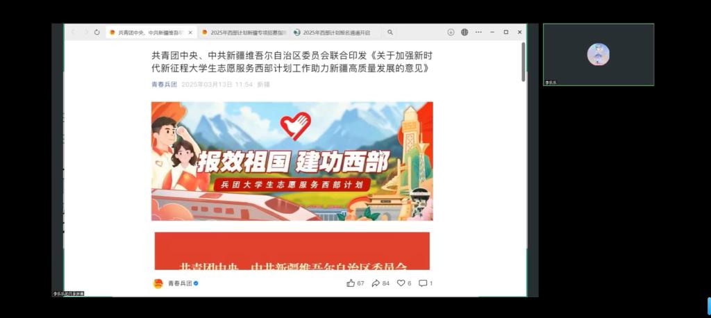 为实现2025届毕业生高质量充分就业,拓宽毕业生就业渠道,帮扶就业困难群体落实就业意向,教育学院于3月30日晚19:00通过线上腾讯会议召开了2025年大学生志愿服务西部计划动员会暨优秀志愿者经验交流会,2025届毕业生代表参加了此会议,会议由毕业班辅导员姜红老师主持。