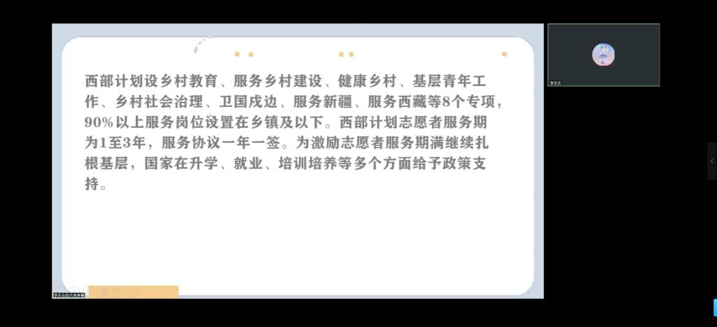 会上,姜红老师首先向参会学生详细介绍了2025-2026年度西部计划最新相关政策,鼓励同学们积极响应党和国家的号召,不以山海为远,主动到西部建功立业。