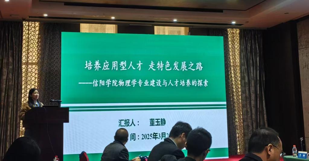 董玉静以《培养应用型人才走特色发展道路——信阳学院物理学专业建设与人才培养探索》为题,通过“学校简介”“建设举措”“建设成效”和“发展规划”四部分,系统展示了信阳学院物理学专业在人才培养方案修订、课程设置、实验室建设等方面的做法。与会专家对信阳学院物理学专业的建设给予了肯定和高度评价。