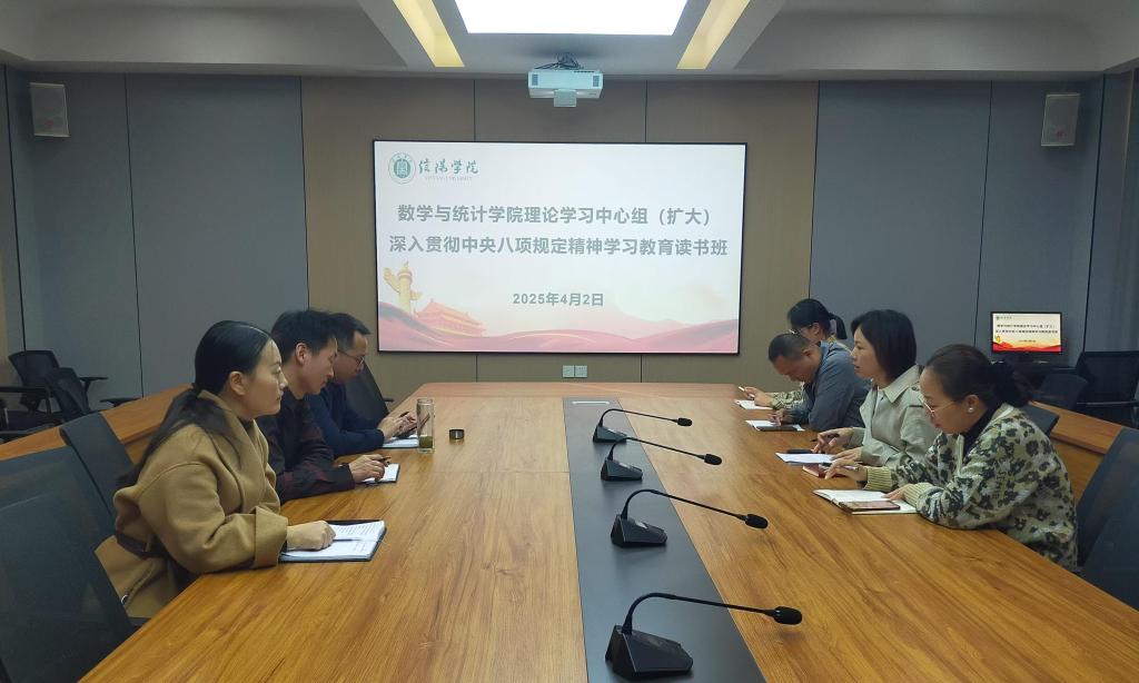 为推进学习教育走深走实,按照党中央要求和学校党委有关安排,4月2日下午,数学与统计学院理论学习中心组(扩大)深入贯彻中央八项规定精神学习教育读书班在社科楼419会议室举办。会议由学院党总支书记高昌慧主持,党总支委员、各支部书记参加了会议。