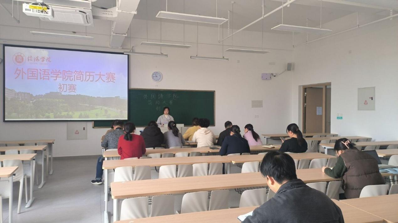 为助力学生提升求职竞争力,强化职业发展核心技能,3月28日下午,外国语学院在南湖校区教二楼411教室举行简历制作大赛院级初赛。学工干事何珊珊,团总支书记郑青及全体辅导员担任评审,评审标准特别设置“语言能力呈现”“经历结构化表达”“岗位匹配度”等细分指标。