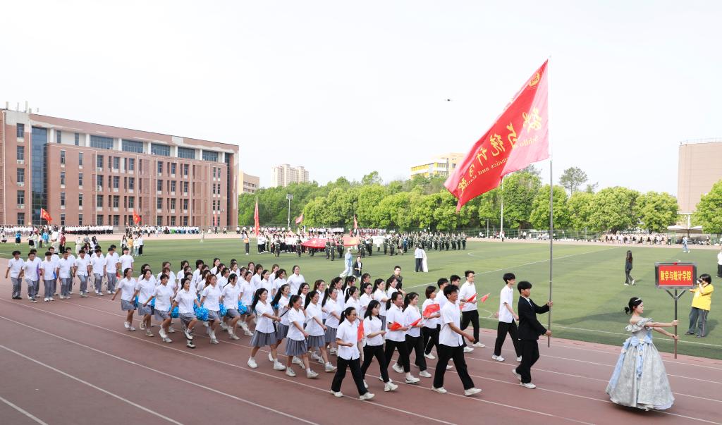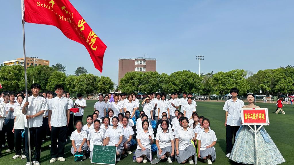 开幕式上,由数学与统计学院师生组成的方队步伐铿锵、口号嘹亮。“数统力量,无可限量;运动赛场,斗志昂扬。”的口号响彻云霄,队员们身着整齐统一的服装,手持数学公式展板,将专业特色与运动精神巧妙融合,展现出严谨理性与青春活力的完美结合,赢得现场观众阵阵掌声。