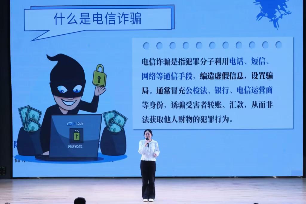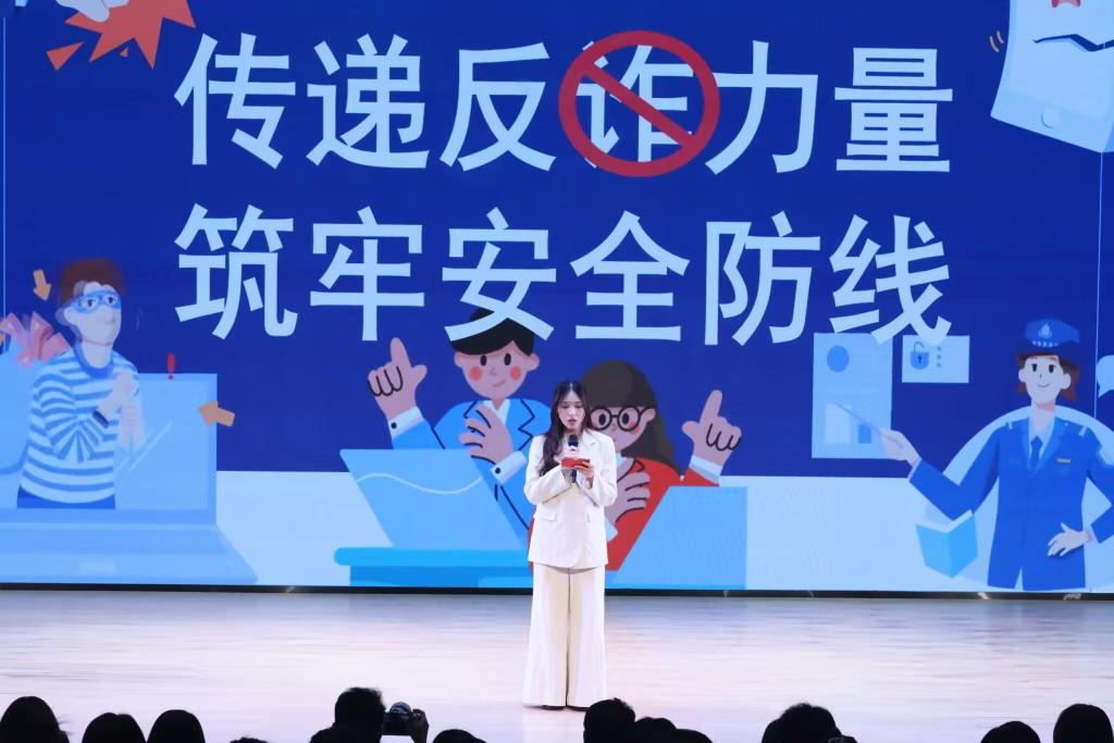 活动伊始,主持人张艺以近期高校诈骗典型案例为切入点,深入剖析诈骗分子惯用手段,强调防范意识的重要性。随后,反诈宣讲志愿者龚喜通过情景模拟、数据展示等形式,向在场同学揭秘“刷单返利”“冒充公检法”等常见骗局,并传授“三不”口诀——不轻信、不透露、不转账。生动的讲解引发阵阵掌声,现场互动氛围热烈。