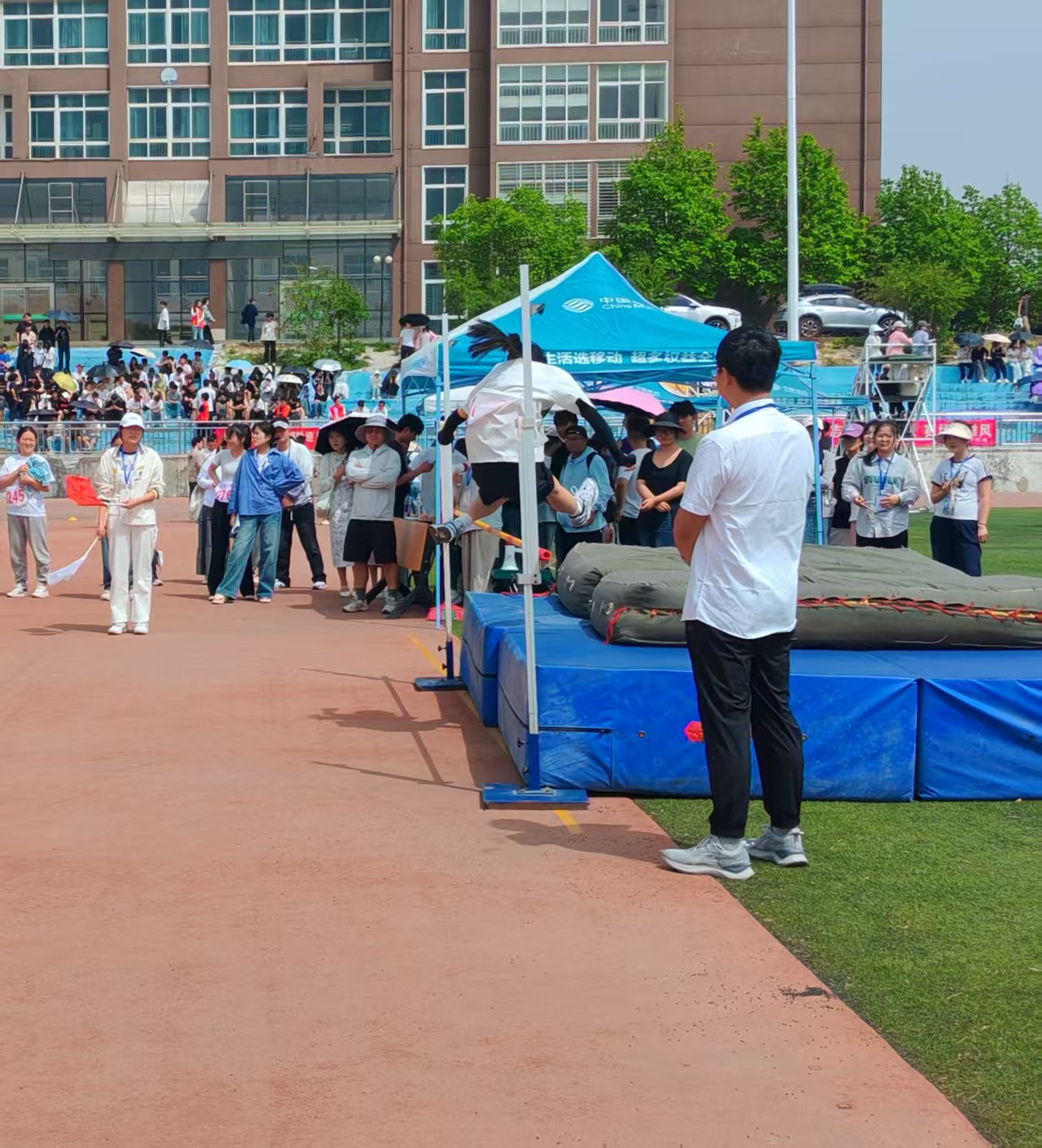 在阳光的照耀下,跳高的赛场格外耀眼。运动员们轻轻一跃,身轻如燕;高高飞起,超越极限。每一次升高横杆,都是一次新的挑战;每一次成功过杆,都是一次自我的突破。