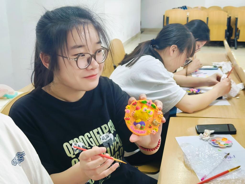 在老师的引导下,同学们挑选心仪的石膏娃娃,执起画笔专注创作。明亮的黄色勾勒出灿烂笑脸,温柔的粉色晕染浪漫氛围,缤纷色彩在笔尖流淌,将内心情绪化作生动的艺术表达。大家沉浸于创作之中,将日常压力与情感倾注于每一笔勾勒,现场洋溢着专注与愉悦的气息。