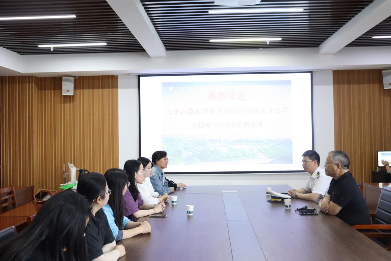 为贯彻落实教育部“访企拓岗促就业”专项行动要求,深化产教融合、校企合作,4月27日下午,外国语学院开展添翼海事服务有限公司专场招聘座谈会。外国语学院党总支副书记程娇炎、学工干事何珊珊及2025届毕业生辅导员参会,与企业代表共同探讨航海人才培养新模式,搭建高质量就业对接平台。