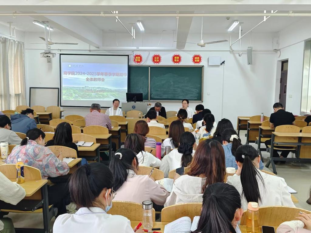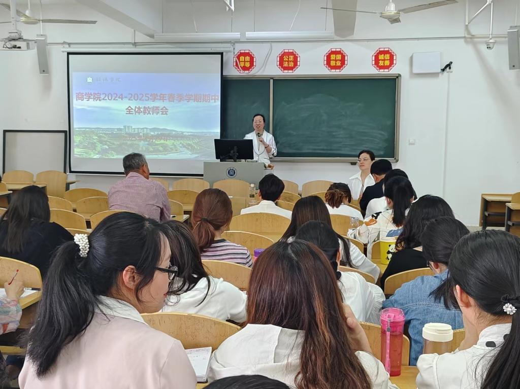 4月29日下午,商学院在综合楼608教室召开2024—2025学年春季学期期中全体教师会。商学院党总支书记胡秀云,副院长李毓、吴新静及全体教师参会,会议由胡秀云主持。