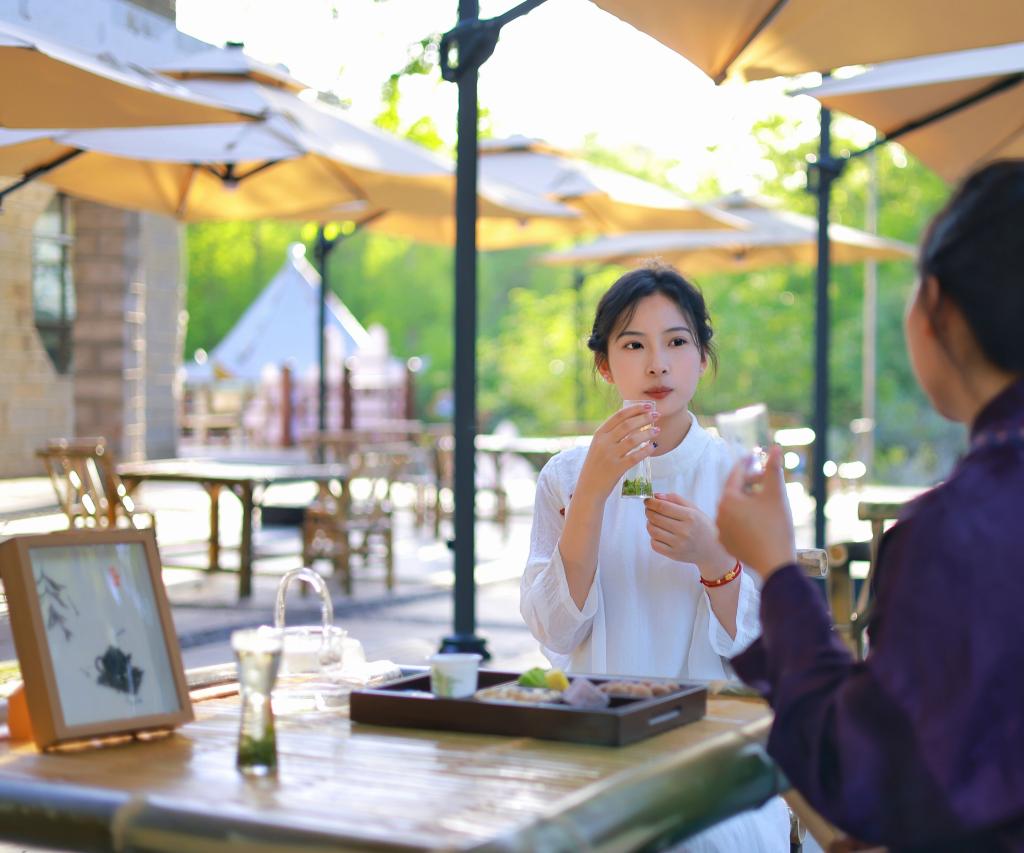 鸡公山茶艺表演区是传统技艺的展示窗口。范佳丽同学发挥创意设计特长,参与茶艺舞台的视觉布景设计,以水墨山水为基调的舞台背景与茶艺表演相得益彰。部分学生志愿者还穿上传统服饰,协助非遗传承人完成茶道展演,通过茶席布置、礼仪示范等细节传递传统文化的美学意境。