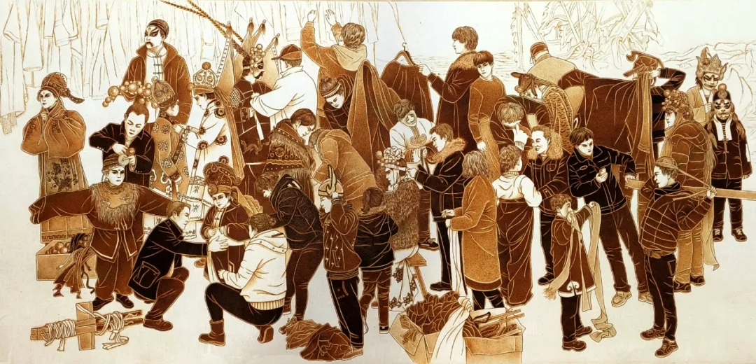 《古城正月》是我校美术与设计学院教师范士轩的国家艺术基金创作成果,属于大型民俗乡土题材“正月风”系列作品之一。作品对国家历史文化名城浚县正月民俗中以高跷项目为主的社火活动予以全景式的记录和特写式的展现,以朴素、厚重的笔墨、色彩表现了新时代年节时空下中原人民的喜庆与祥和。