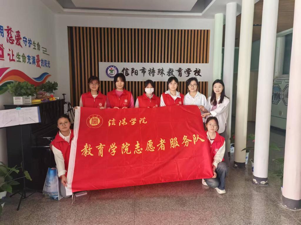 为培养大学生的社会责任感,助力特殊儿童健康成长,教育学院爱心支教团于5月9日下午走进信阳市特殊教育学校,开展了“爱育无声,筑梦特教”志愿支教服务活动。带队老师刘俊言、李鑫、姜红和六名志愿支教学生参与了此次活动。