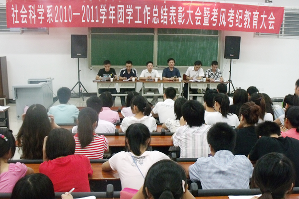 6月17日晚7点,社会科学系在图书馆101教室举行2010—2011学年团学总结表彰暨考风考纪教育会。社会科学系主任陈录生教授、行政秘书秦笠、教学秘书余源鑫、学工秘书胡志国和全体团学干部参加了此次会议。