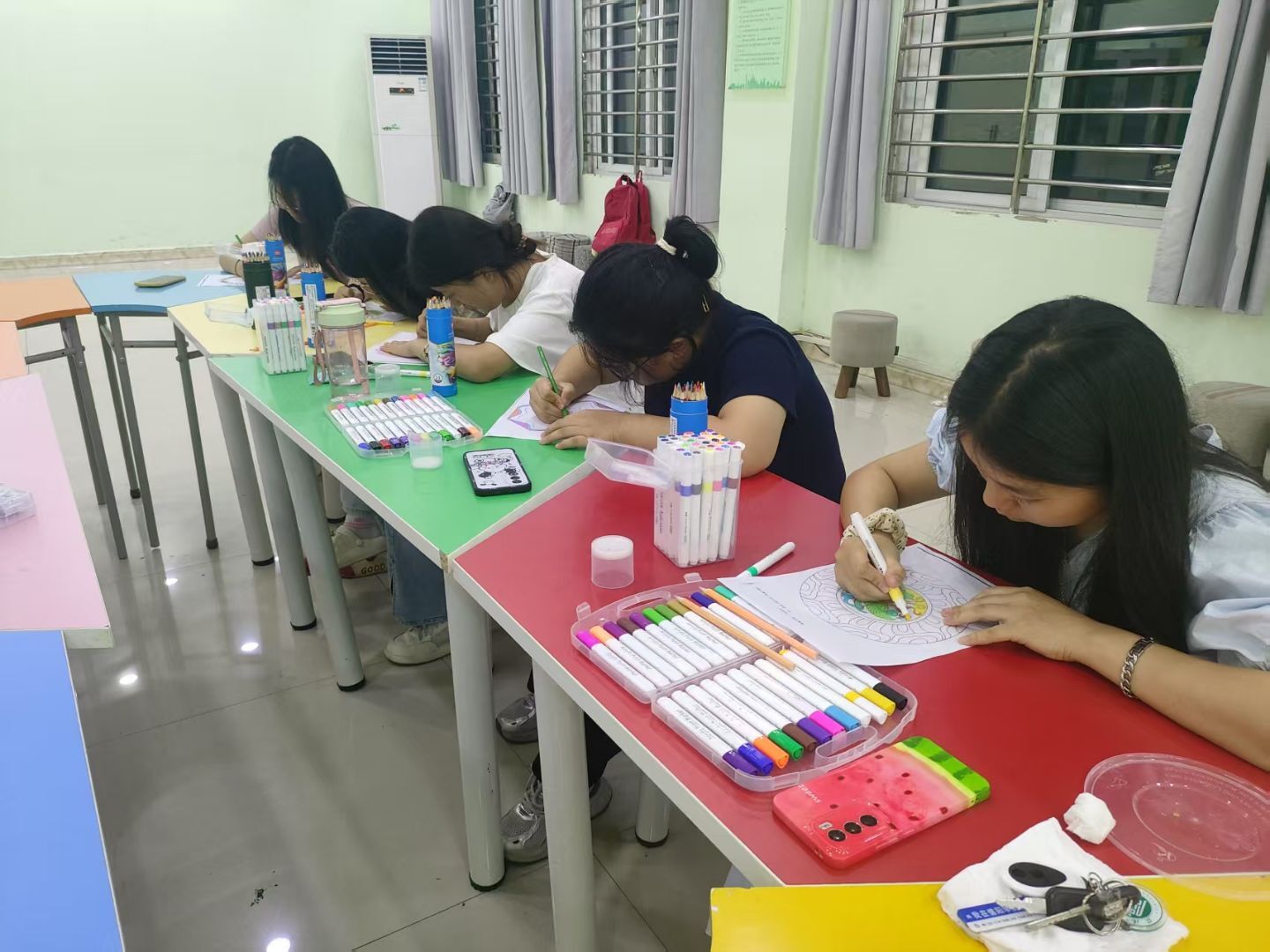 绘画疗愈:通过对称构图与自由填色,参与者实现情绪可视化释放。活动后,多名学生将作品设为手机壁纸,作为日常情绪调节工具。