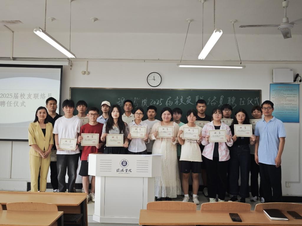 在庄重的氛围中,党总支书记赵佳、学工秘书杨晓杰及毕业班辅导员共同为受聘校友联络员颁发聘书和纪念品,并与他们合影留念。现场掌声热烈,联络员们纷纷表示将不负重托,切实履行职责,为校友事业和学院发展贡献力量。
