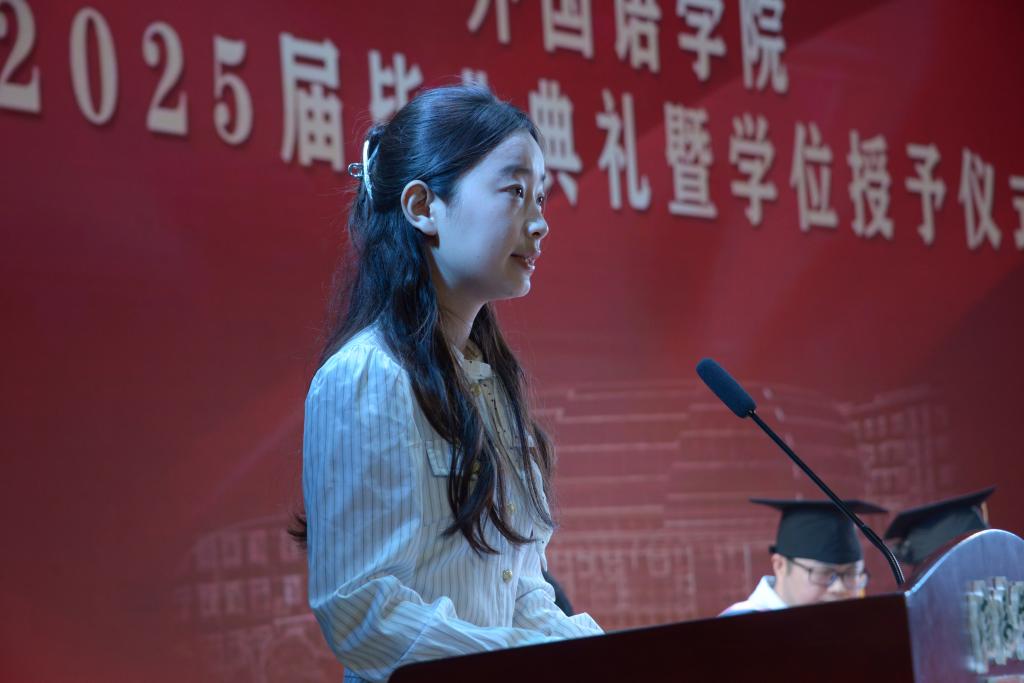 2023级英本3班的冯淑婷作为在校生代表发言。她表示,学姐学长为在校生树立了光辉榜样,用实际行动诠释了习近平总书记对青年“有理想、敢担当、能吃苦、肯奋斗”的期望。她代表全体在校生,祝愿即将启程的学长学姐们,带着母校的勇气与智慧,在更广阔的天地中不畏风雨、勇往直前,实现人生理想。