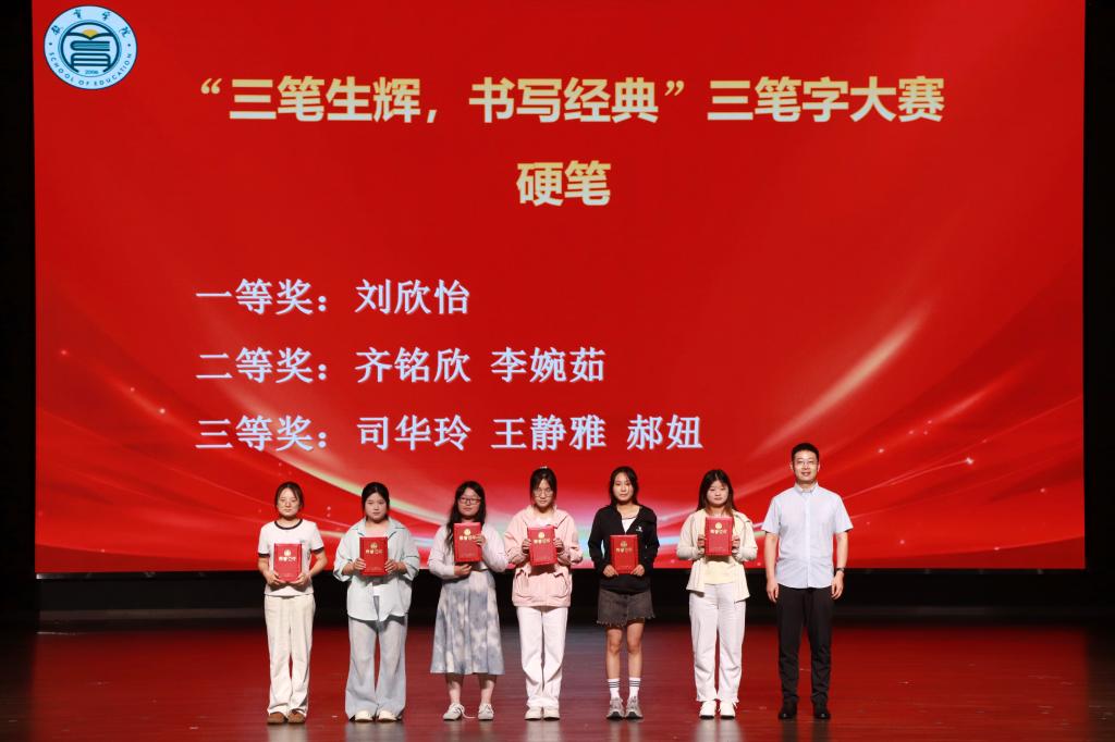 晚会以“匠心育才筑梦行,知行合一创未来”为主题,巧妙融合节目展演与颁奖环节,涵盖了歌曲、舞蹈、情景剧等多种类型,精彩纷呈。活力四射的舞蹈拉开序幕,瞬间点燃现场热情;别开生面的“教具展示走秀”成为智慧与创意的舞台,各班级代表将日常教具转化为艺术表达,展现出教育设计的独特魅力,令现场观众赞叹不已。在颁奖典礼环节,教育学院教师教育教研室主任闫楷汶、教育学教研室主任冯海燕、学工干事胡超、教学干事刘勋达、行政干事白鹭依次为三字笔、模拟课堂短视频创作和板书设计大赛的获奖者齐铭欣、刘欣怡、李颖等四十人颁发荣誉证书,共享荣誉时刻。