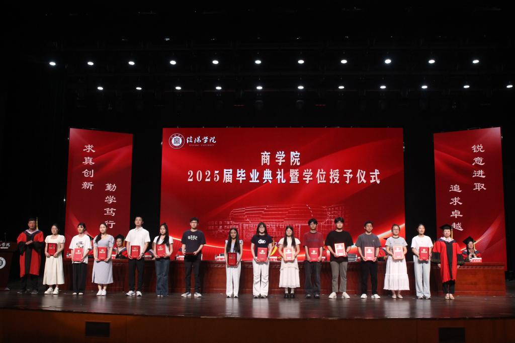 副校长王强发表讲话。他代表学校向圆满完成学业的同学们表示热烈祝贺,肯定了本届毕业生在专业学习、竞赛实践等方面取得的优异成绩。面对当前世界百年未有之大变局,数字经济蓬勃发展,产业变革日新月异,王校长希望同学们始终牢记“求真创新,勤学笃行”的校训,永葆求知热情,保持开放心态和持续学习的能力,做终身学习的践行者;坚守诚信品格,恪守职业道德,做商业文明的守护者;勇于开拓创新,敢于挑战未知领域,做时代变革的引领者;常怀感恩之心,在追求个人发展的同时,不忘回馈社会,用实际行动诠释新时代青年的责任担当,做社会价值的创造者。最后,王校长表示母校永远是同学们的精神家园,母校将永远关注着同学们的成长,期待学子捷报频传,并衷心祝愿同学们前程似锦、鹏程万里,历尽千帆,归来仍是少年。
