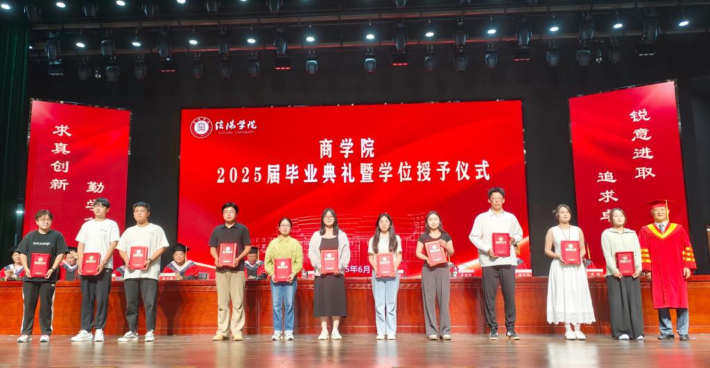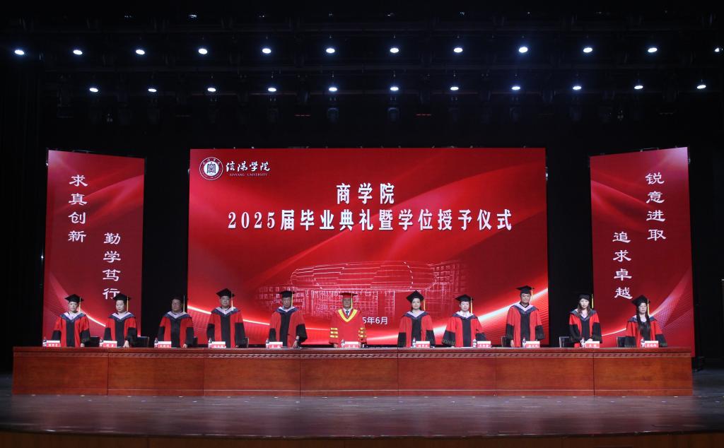 6月5日下午,商学院2025届毕业典礼暨学位授予仪式在音乐厅隆重举行。信阳学院副校长王强,商学院党总支书记胡秀云,副院长李毓、吴新静,学院学位评定委员会委员和特聘教授代表,教师代表、商学院全体辅导员及在校毕业生共同参加了典礼。典礼由党总支书记胡秀云主持。