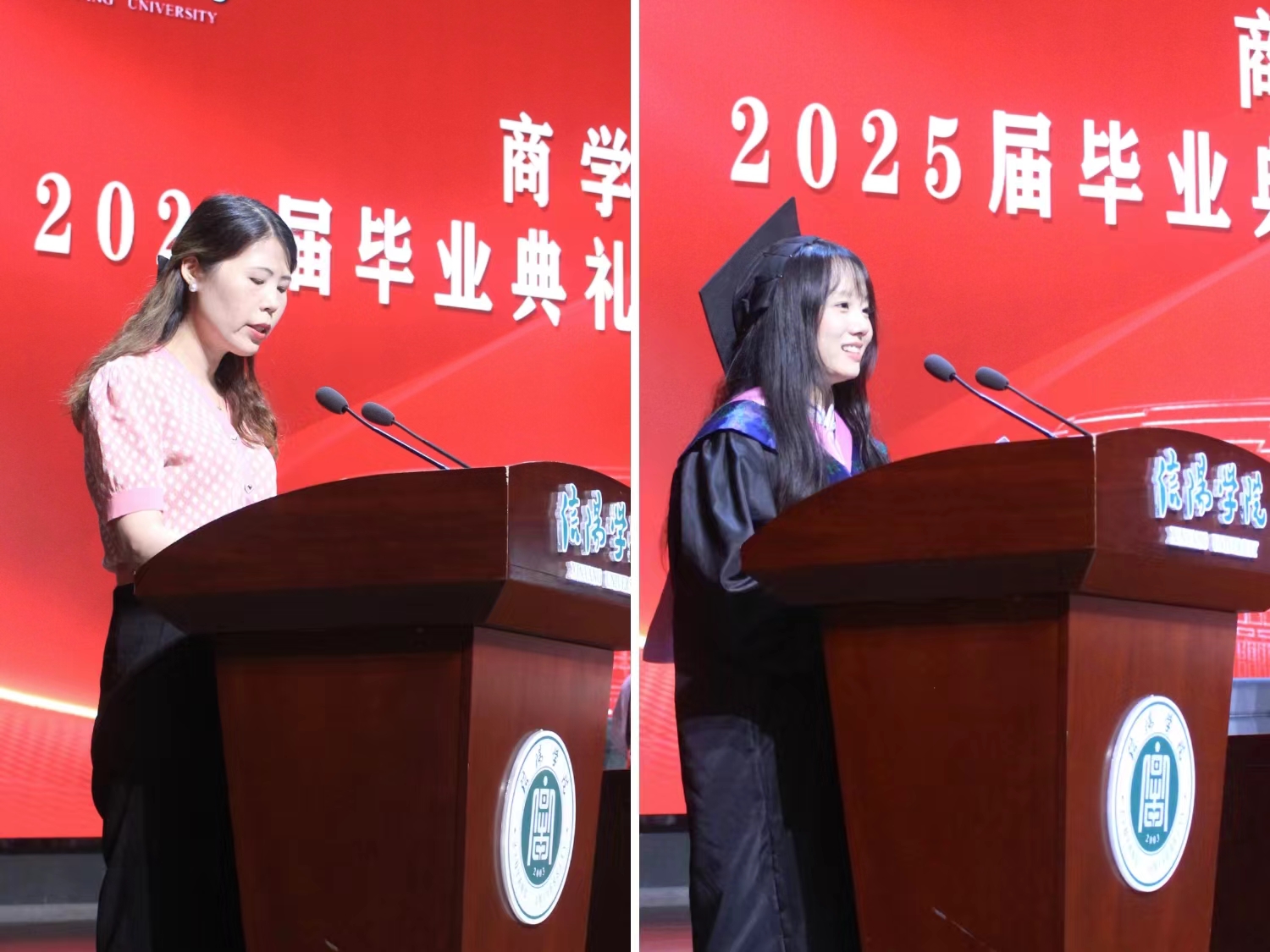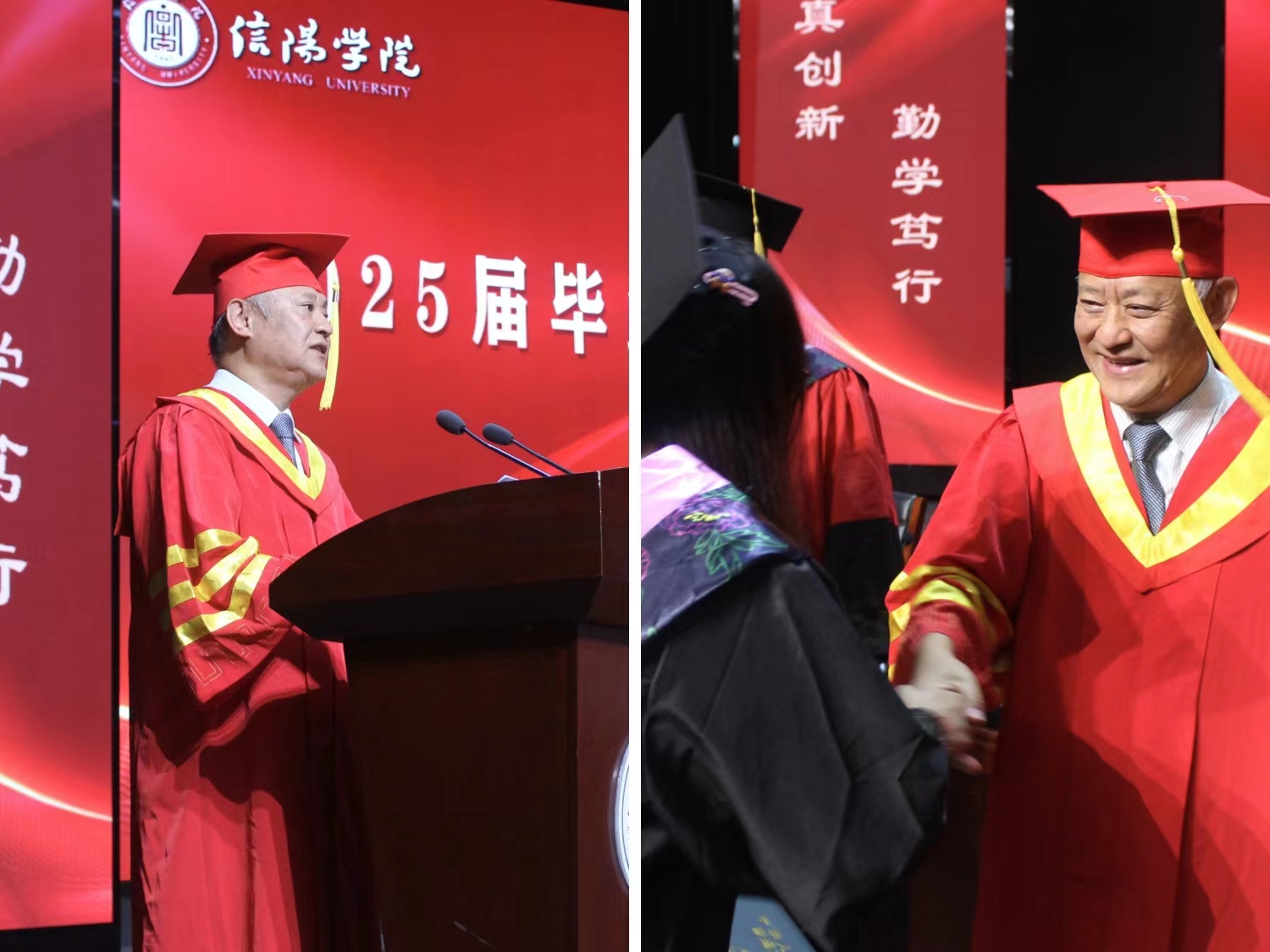 毕业典礼暨学位授予仪式在激昂庄严的国歌声中拉开帷幕。副院长吴新静宣读了《关于表彰2025届毕业生考取硕士研究生的决定》及《关于表彰2025届优秀毕业生的决定》。副院长李毓宣读了《信阳学院关于授予2025届本科毕业生学士学位的决定》。