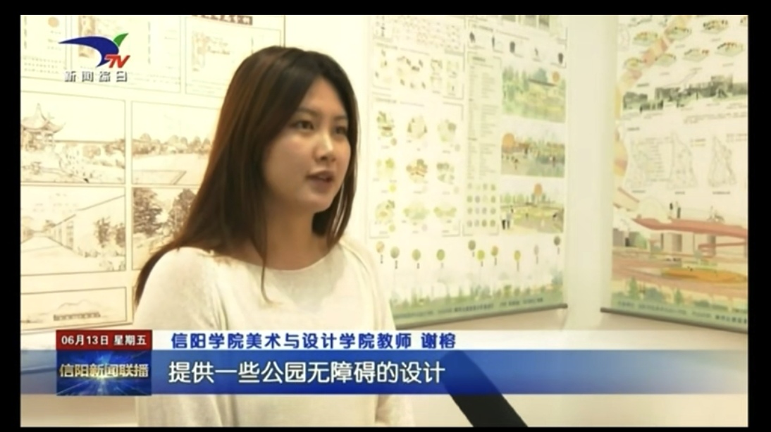 美术与设计学院视觉传达设计专业教师娄濛作为高校教师代表发言,他结合自身教学实践,阐述了美术与设计学院在设计人才培养模式上的积极探索,从设计教育创新的角度分享了育人经验与思考。环境艺术设计专业教师谢榕在接受信阳广播电视台采访时表示,在与学生一起交流毕业设计命题时,着重在“老年无障碍空间设计”“服务乡村振兴”等社会实际需求上进行深入拓展,使得学生可以在能够落地的项目中完成毕业课题。