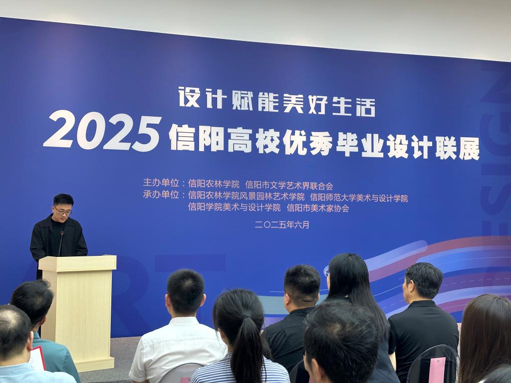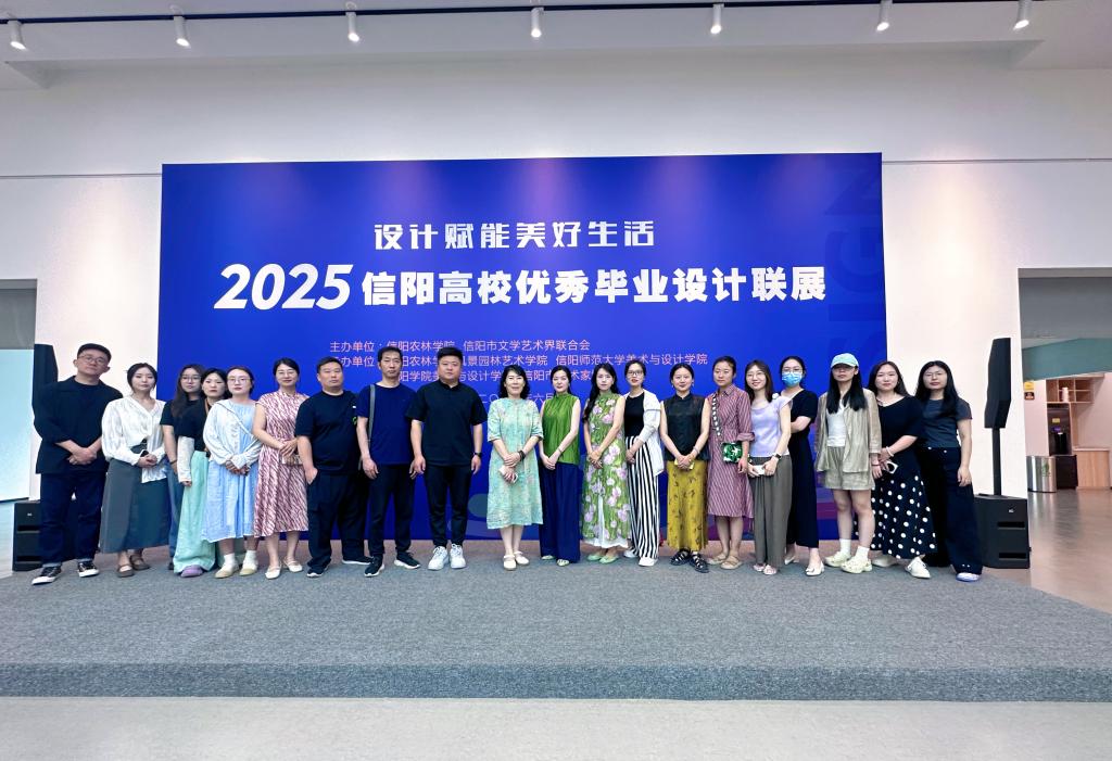 6月12日上午,由信阳农林学院与信阳市文学艺术界联合会主办,信阳农林学院、信阳师范大学、信阳学院、信阳市美术家协会承办的“设计赋能美好生活——2025信阳高校优秀毕业设计联展”在信阳市文学艺术院三楼展厅盛大启幕。本次联展汇聚了信阳农林学院、信阳师范大学、信阳学院三所高校设计学科的优秀作品,集中展示了设计类专业人才培养的最新成果,是推动校地协同发展、促进设计创新服务地方建设的重要实践平台。美术与设计学院教学副院长王伟带领视觉传达设计、环境设计、数字媒体艺术专业的骨干教师及优秀学生代表50余人参加了开幕式及后续活动。