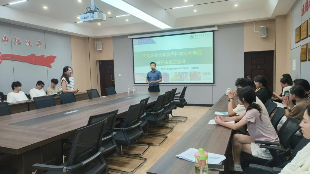 为深入推进校际合作,助力食品学科高层次人才培养,2025年6月24日上午,河南农业大学食品科学技术学院一行到我校开展研究生招生宣传与交流活动。本次活动在我校理工学院举行,旨在向我校优秀学子宣传该院研究生招生政策、学科特色及科研方向,拓宽学生深造渠道,提升发展平台。