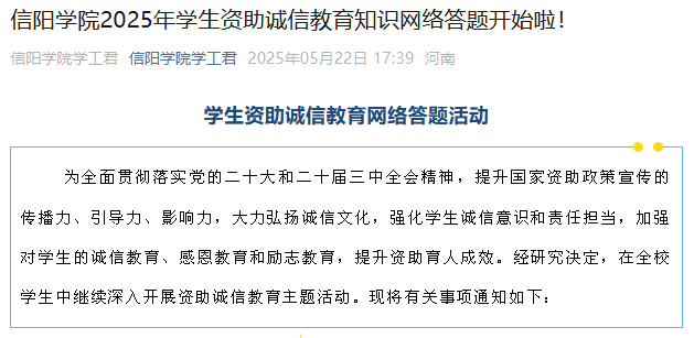 在宣传教育方面,学校依托“信阳学院学工君”微信公众号,开设资助与诚信教育专栏,组织开展资助诚信教育网络答题活动,内容涵盖征信知识、金融安全、风险防范等方面,活动累计参与答题人数13000余人,有效提升了学生的征信意识、金融意识、风险意识、法律意识。
