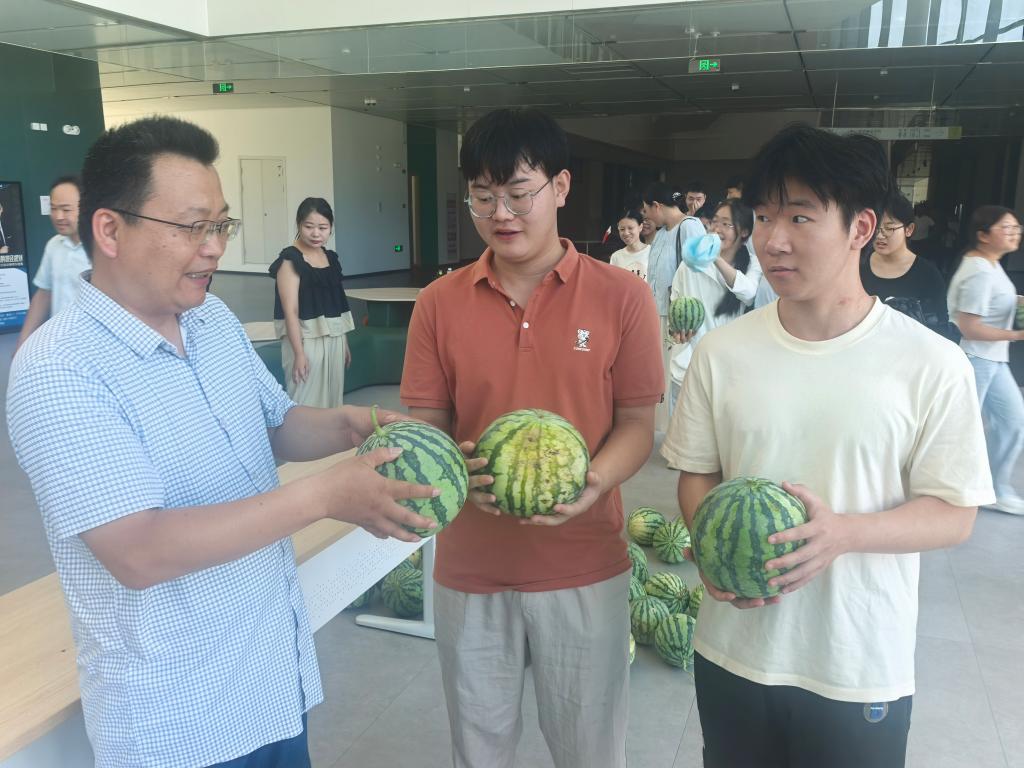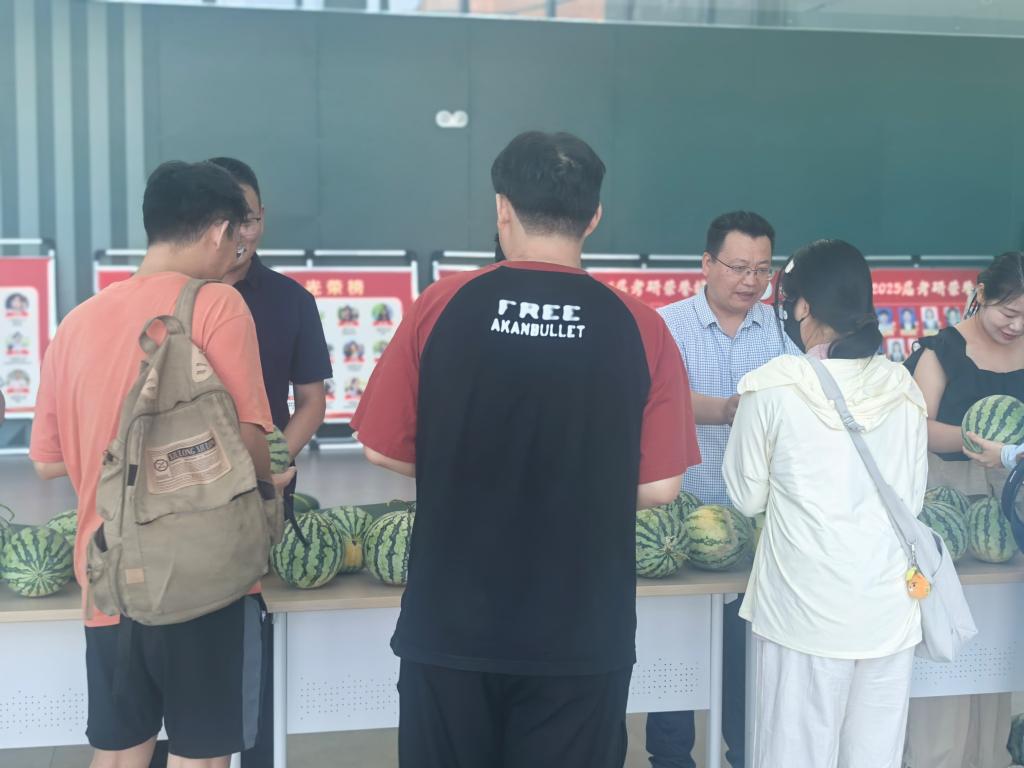 会后,各位老师代表学院将西瓜慰问品发放到同学们的手中。