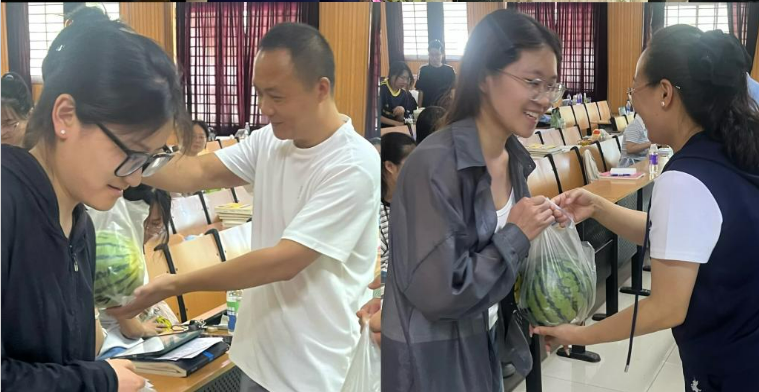 随后领导老师们为同学们一一送上慰问品西瓜,甜甜的西瓜不仅饱含着学院对同学们深深的祝福,同时承载着学院对考研学子的殷切关怀。