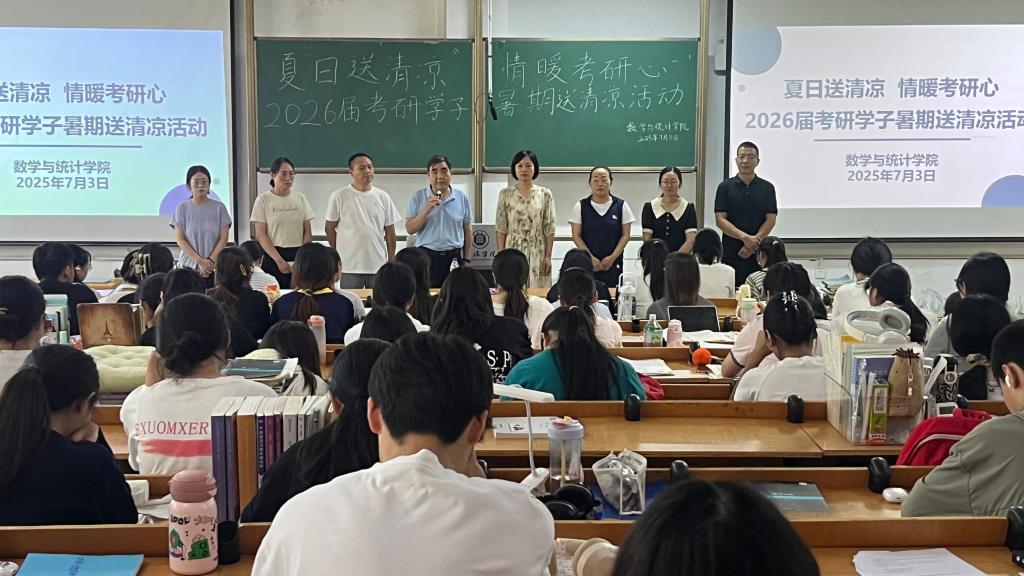 为表达对考研学子的关心与支持,向炎炎夏日中奋战的同学们送去清凉与关怀,7月3日上午,数学与统计学院院长俞迎达、党总支书记高昌慧、教学副院长张聪、行政干事闫珍珠、学工干事田媛及毕业班辅导员一行到社科楼112教室走访慰问暑期留校考研学生,本次活动由高昌慧主持。