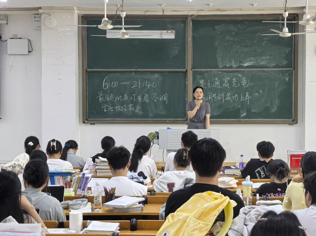 党总支书记胡秀云在讲话中,首先向高温酷暑下坚守校园、全心投入备考的同学们致以敬意。她高度肯定了大家“以笔为犁、向学不止”的坚韧精神,并深情寄语,此刻,翻过的每一页书,都是通往成功彼岸的基石;攻克的每一道题,都是未来笔下自信的底气。那些默默耕耘的日夜,终将在考场上绽放出最耀眼的光彩。胡书记还特别叮嘱同学们,天气炎热,要时刻绷紧安全之弦,远离危险水域,做好自我防护。在专注备考的过程中,既要全力以赴、争分夺秒,也要劳逸结合、张弛有度,守护身心健康。这番贴心的话语,让在场的学子们倍感温暖与鼓舞。
