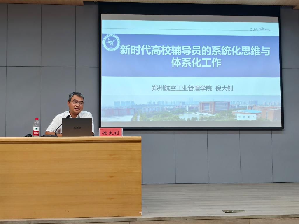 当日下午,郑州航空工业管理学院商学院党委副书记倪大钊受邀授课。他以《新时代高校辅导员的系统化思维和体系化工作》为题,结合高校学生工作新形势新要求,从学风建设、学生日常管理、突发事件应对等方面分享实践经验,为参训辅导员提供了可借鉴、可落地的工作思路,助力提升学生工作实操能力。