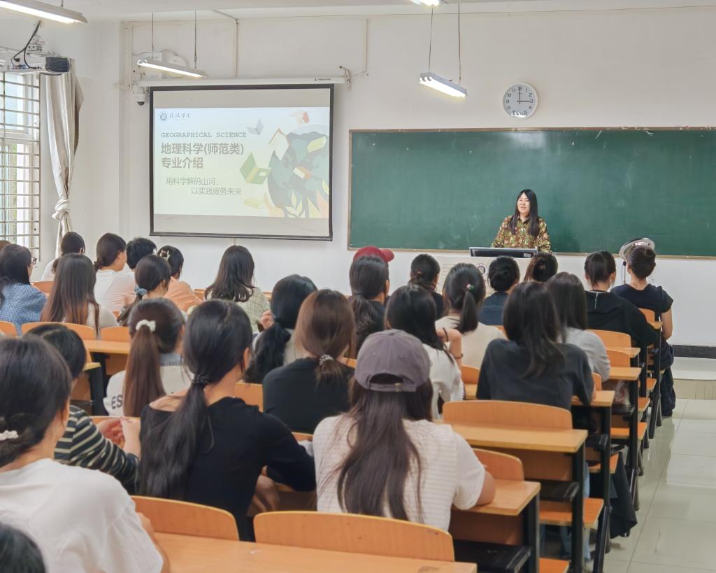地理科学教研室主任魏新玲副教授向同学们介绍了地理科学专业的发展历程、培养目标、核心课程、办学条件、专业特色、就业方向等,通过介绍,学生对地理科学专业有了初步的了解。然后,魏主任通过大量的数据和案例分析了学生的就业和考研情况,并通过优秀校友的事迹鼓励同学们,在大学,只要同学们继续努力、不畏艰难、仍然可以攀登上属于自己的高山。最后,魏主任重点介绍了地理科学专业的研究领域及地理科学的学科特征。并从地理学学什么、为什么学和怎么学三个方面进行了什么的讲解。她指出,地理科学是一门理论性与实践性都很强的综合学科,既研究自然地理,也研究人文地理。随着技术的发展,3S成为地理学研究的重要议题,并在很多方面改变着人类的生活。魏主任结合图片、例子生动形象地向大一新生展示了地理科学的魅力及地理科学在人们的生产、生活中的具体应用。