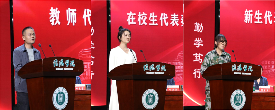 教师代表徐涛涛博士,在校生代表、2025年河南省三好学生秦柯佳,新生代表、美术学专业刘岳杨等分别作了发言。