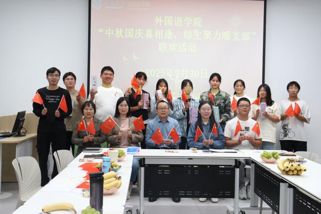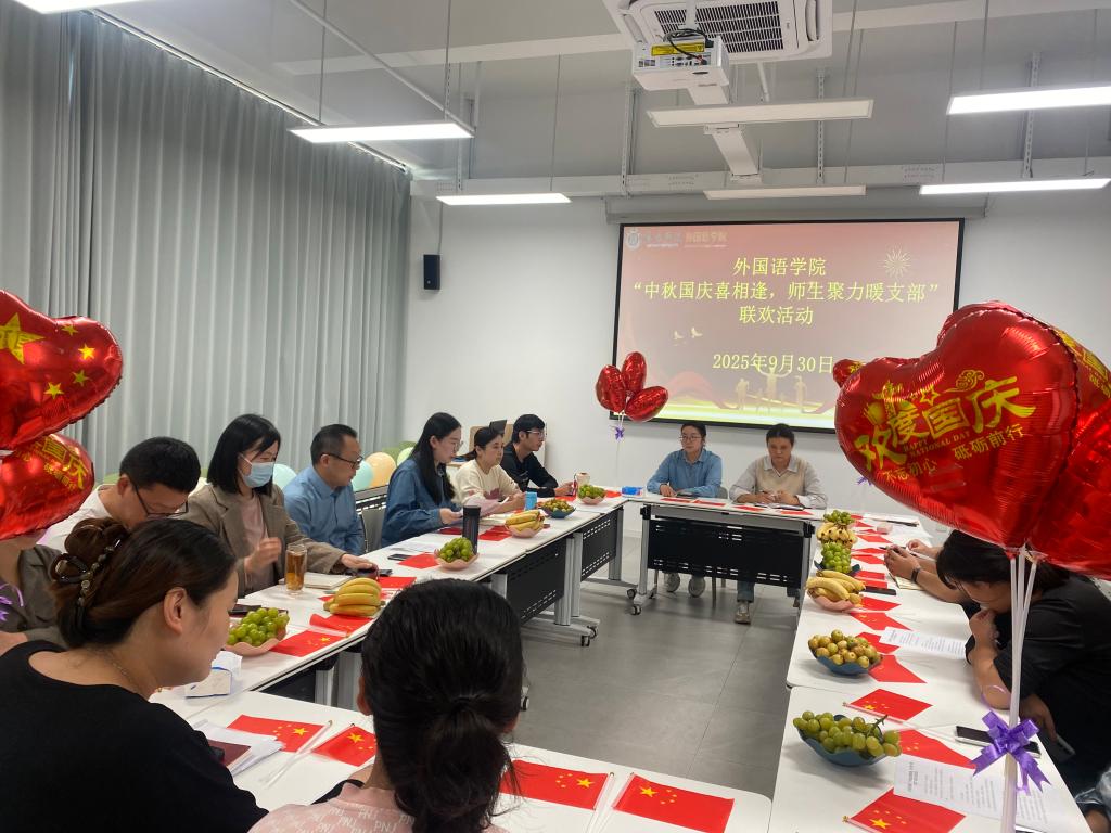 9月30日下午,外国语学院在南湖校区教二楼316会议室举办“中秋国庆喜相逢,师生聚力暖支部”联欢活动。学院领导班子、党支部书记、第一教工党支部代表、第一学生党支部成员以及2025级假期留校生代表共同参加。