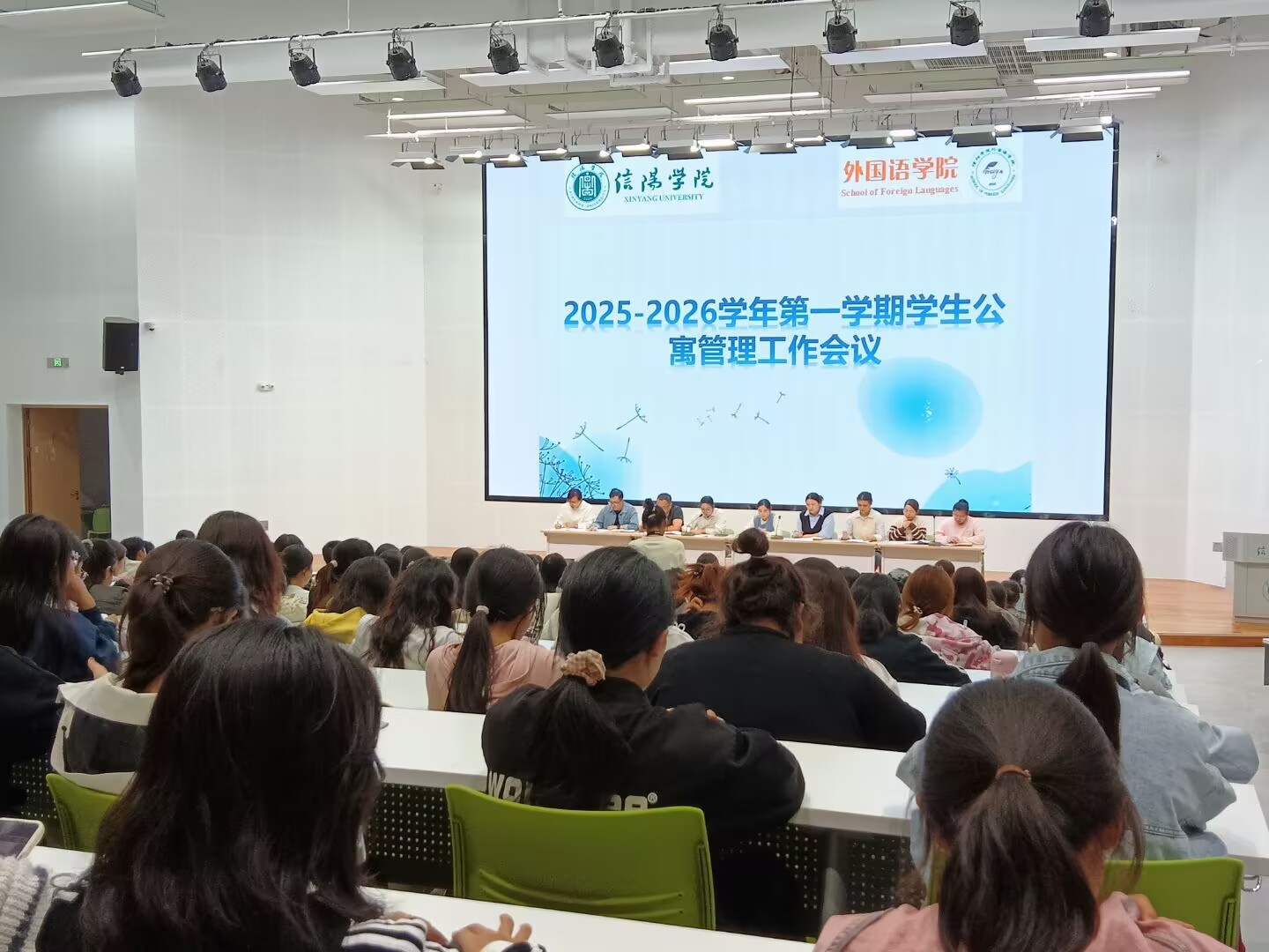 为总结学生公寓管理工作经验,部署下一阶段公寓管理任务,外国语学院于10月13日在教二楼117召开2025—2026学年第一学期学生公寓管理工作会议。参会的人员有外国语学院学工干事何珊珊、团总支书记郑青、各年级辅导员以及全体宿舍长。