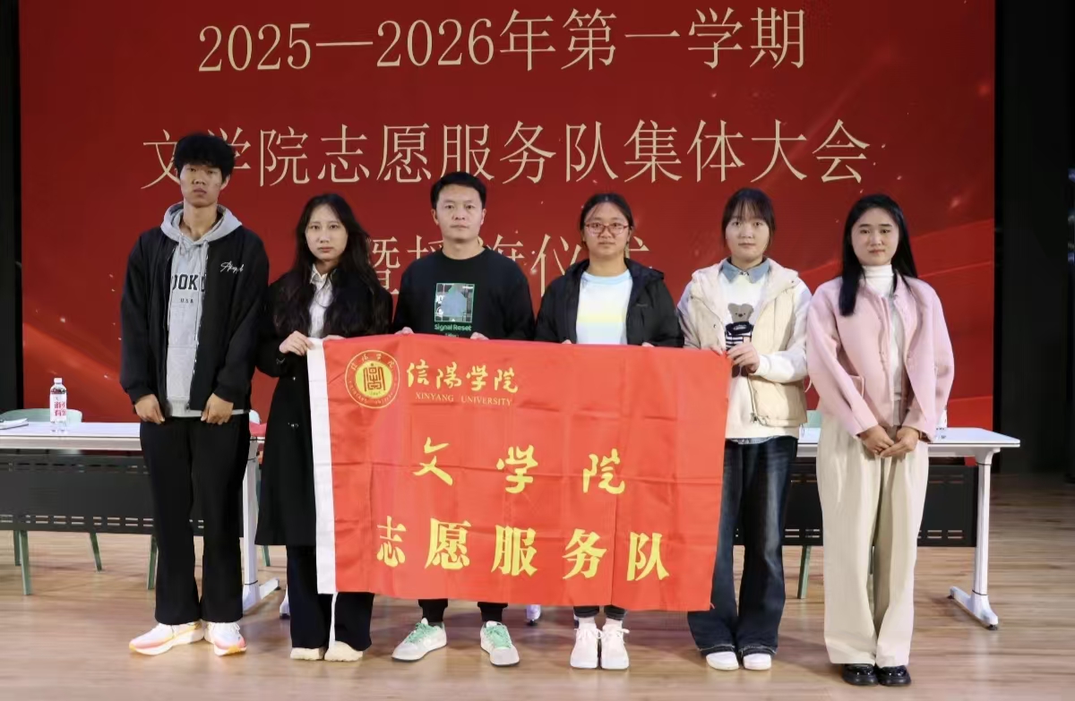 何军华老师与段艳婷老师共同为文学院志愿服务队授旗。鲜红的队旗在掌声中交至队员代表手中,象征着责任与使命的传递。授旗结束后,两位老师与服务队骨干成员合影留念,定格这一庄重时刻。