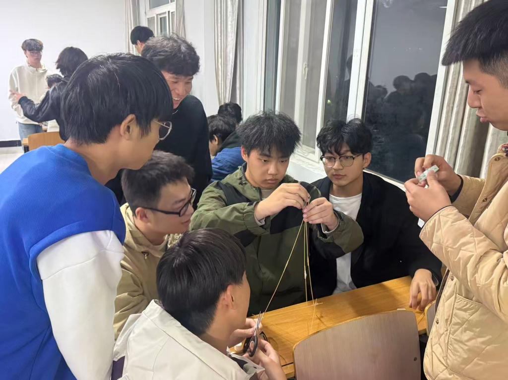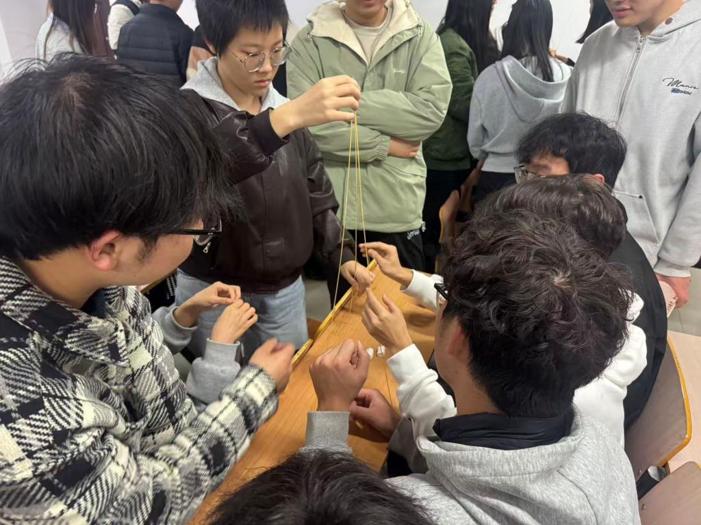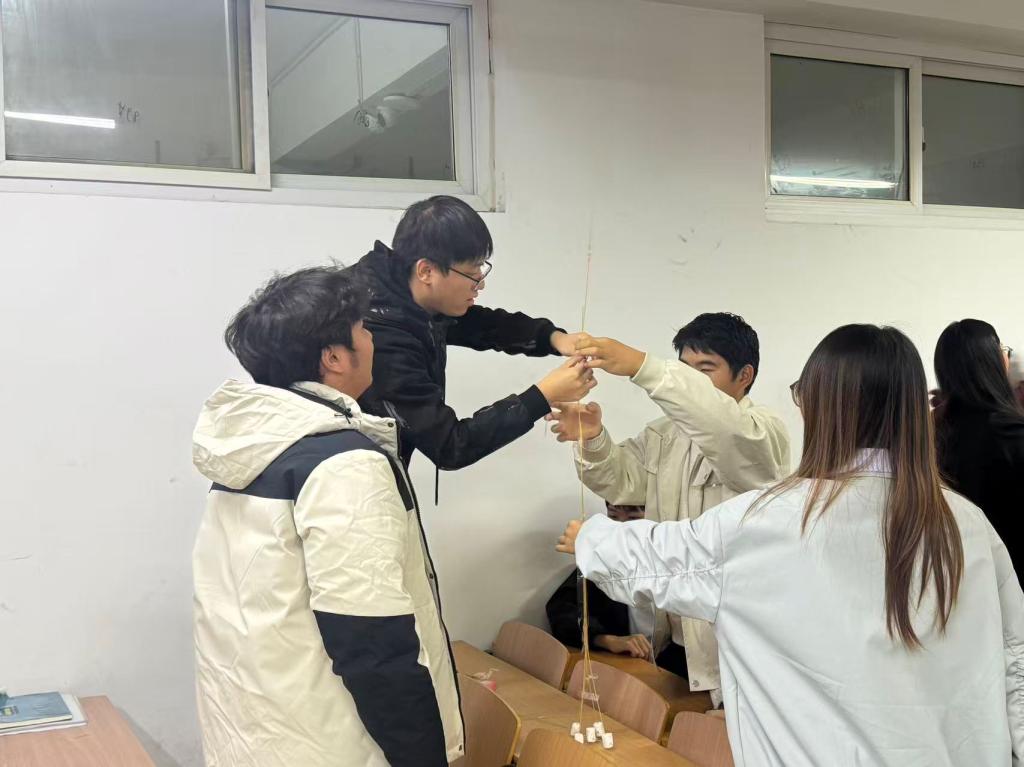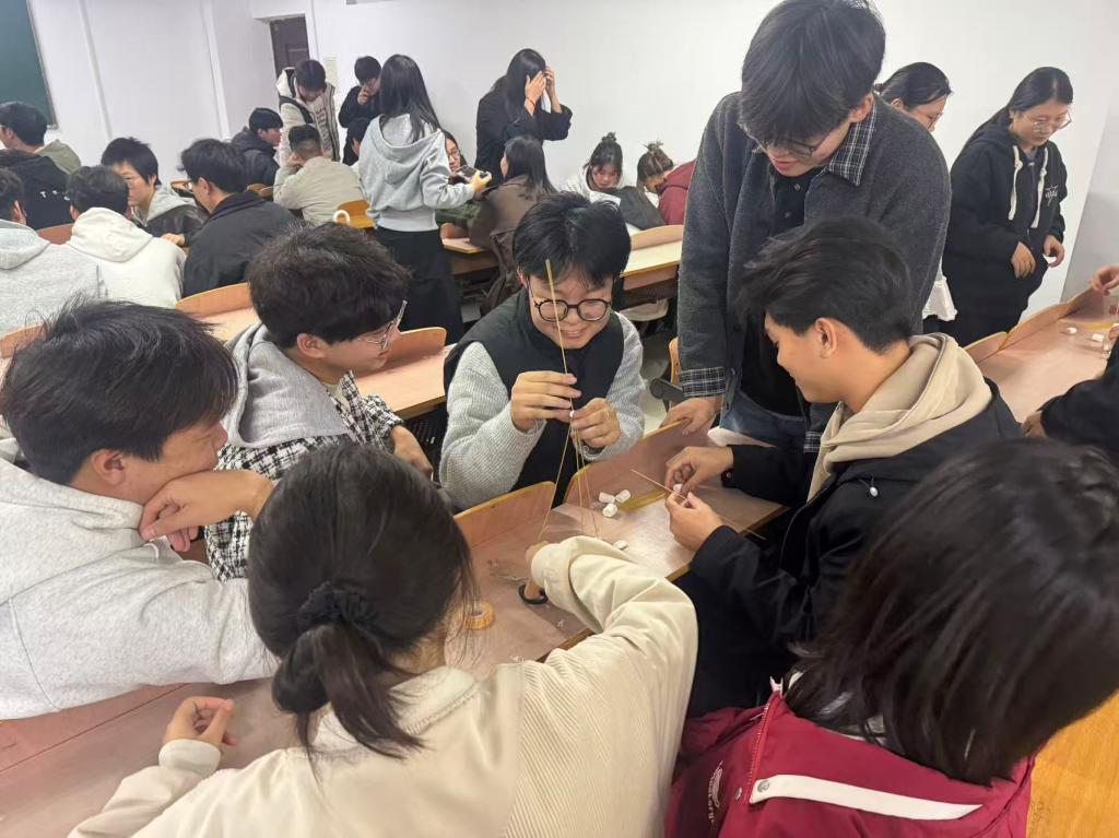在“情绪的毒药”环节中,同学们彻底打破拘谨。由辅导员与学生组成的女巫团,引得同学们认真关注组队风向,不仅降低了大家的社交防御心理,也减少了因班级差异、学业忙碌产生的陌生感,促使同学们主动与不熟悉的同伴产生互动,在女巫选到“毒药”淘汰时,带着队友笑着吃下怪味糖果,将“淘汰”的紧张感转化为集体调侃的乐趣,同甘共苦还强化了队友间的关系。“棉花糖意面叠高高”更是将热情推向高潮。各组30分钟内用20根意面、1米胶带、5颗棉花糖搭出最高塔。同学们把结构力学、材料力学全数搬上场:三角形底座、空间桁架、悬臂配重……当3班“塔吊小队”的“面塔”冲破1米时,2班“基建狂魔”立刻蹲地改良节点,两个班级在这一刻彻底消融成为共同奋斗伙伴,享受这份属于团队的喜悦。