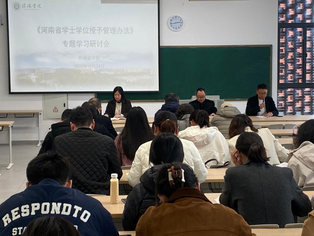 为深入贯彻落实《河南省学士学位授予管理办法》,规范学士学位授予工作,提升人才培养质量,2025年10月30日下午,外国语学院组织召开专题研讨会,深入学习《河南省学士学位授予管理办法》。外国语学院院长罗德喜、党总支副书记程娇炎、教学副院长李静、学院干事和全体教师参加了此次会议。