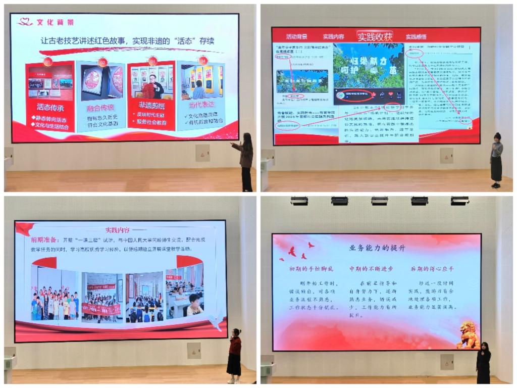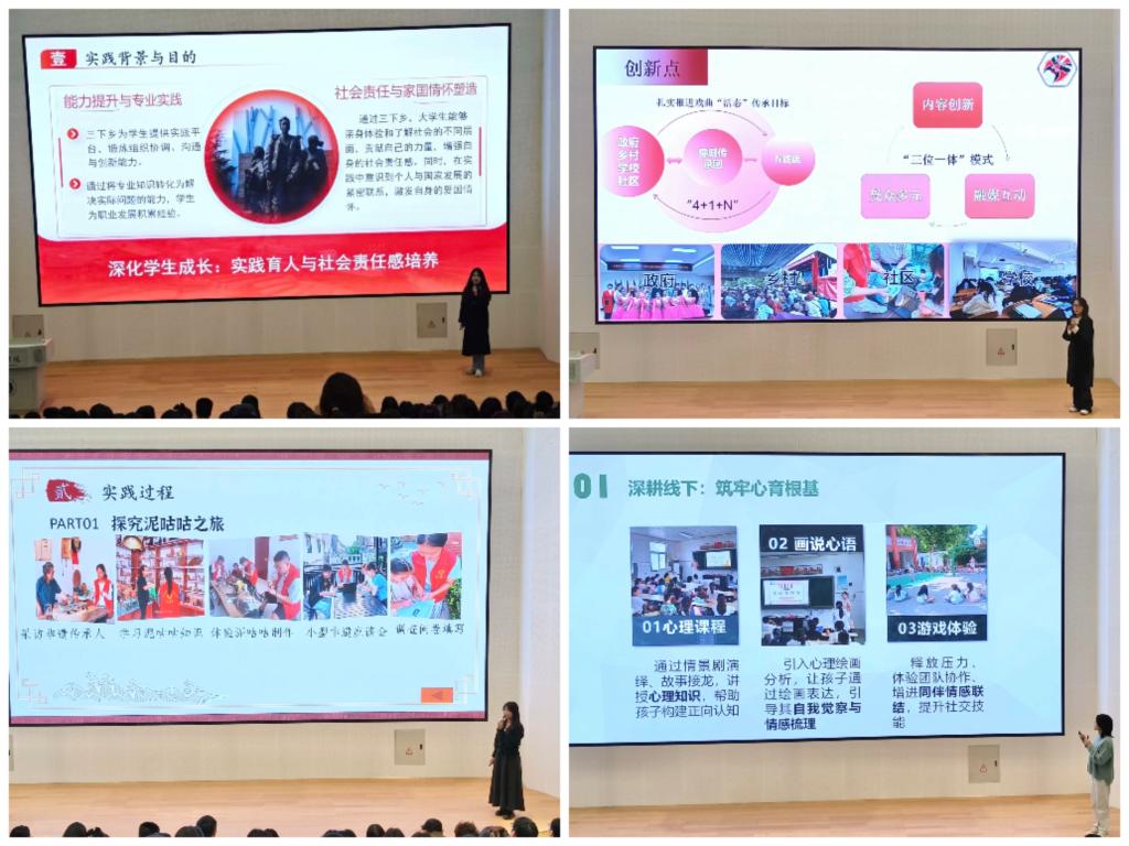 碰撞思想齐分享,总结复盘同进步。表彰结束后,大会进入优秀项目分享环节。12位实践代表依次登台,围绕“三下乡”“返家乡”“向基层报到”等平台,分享了他们在社会实践中的经历与感悟。焦裕禄精神教育实践团聚焦基层服务,展现了在田间地头践行初心、在服务群众中锤炼成长的实践担当;“豫”见新章豫剧文化传承团深耕豫剧文化,探索区域协同机制下焕发经典乡音新活力的实践路径;浚县非遗泥咕咕教育传承团立足民俗文化,分享了将黄河泥塑艺术融入乡村课堂、推动非遗与美育融合的实践故事;青少年心理健康服务践行团紧扣乡村教育需求,讲述了运用专业知识守护青少年心理健康、筑牢心理防线的温暖历程;郑州“二七精神”宣传实践团以剪纸为载体,通过“讲述+展示+体验”的沉浸式活动,传播红色文化,播撒精神火种。张怡宁、郭丽萍等7位先进个人代表则围绕心理关怀、乡村支教、基层公益等主题,分享了以专业技能服务社会、在平凡实践中实现青春价值的生动案例。