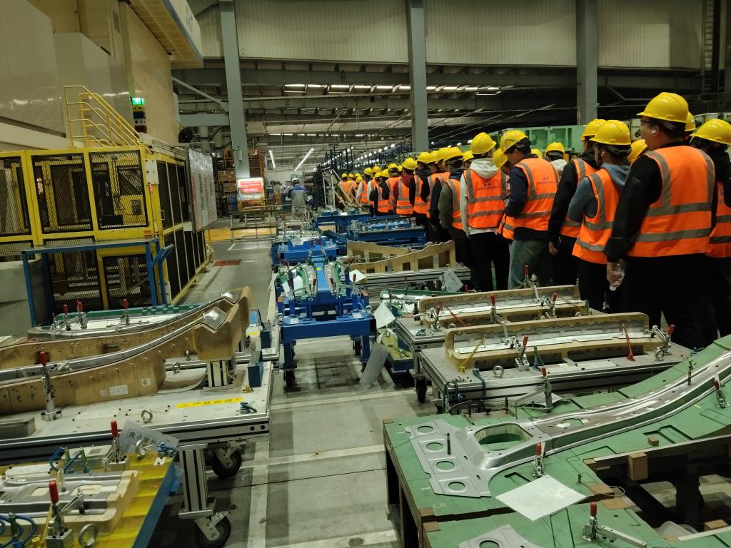 在为期一周的时间内,实习团队以“按工艺路线、分模块研学”的思路,先后走进天籁、探路者、英菲尼迪总装线、汽车电气线路制造厂、汽车焊接线、汽车轮毂铝铸造厂、汽车半轴和制动底板制造厂,深入东风汽车核心生产场景进行沉浸式研学,全链条触摸汽车制造核心环节。其中在天籁、探路、英菲尼迪三大主力车型总装车间,学生们跟随生产线节拍,观察零部件精准装配、整车下线检测的全流程;在汽车电气线路制造车间,观摩了不同规格线束的生产装配过程;在智能焊接车间,学生们近距离观摩机器人焊接、激光焊接的自动化作业过程,重点学习焊缝质量检测标准、设备参数调试要点,直观感受智能制造技术对生产效率的提升作用;在轮毂铝铸造车间,从铝合金原料熔炼、压铸成型到热处理强化,学生们全程跟踪轮毂毛坯的生产链路,深入理解铸造工艺参数与轮毂强度、轻量化性能的关联逻辑;在半轴与制动底板制造车间,针对关键安全部件的精密加工工序、尺寸公差控制、性能测试标准展开专项学习,明晰核心部件制造对整车行驶安全的决定性意义。此次实践不仅帮学生厘清了汽车制造各环节的逻辑闭环,更让他们对整车研发、工艺管理、质量检测等岗位的技能需求有了具象认知,为后续职业规划提供了实践依据。