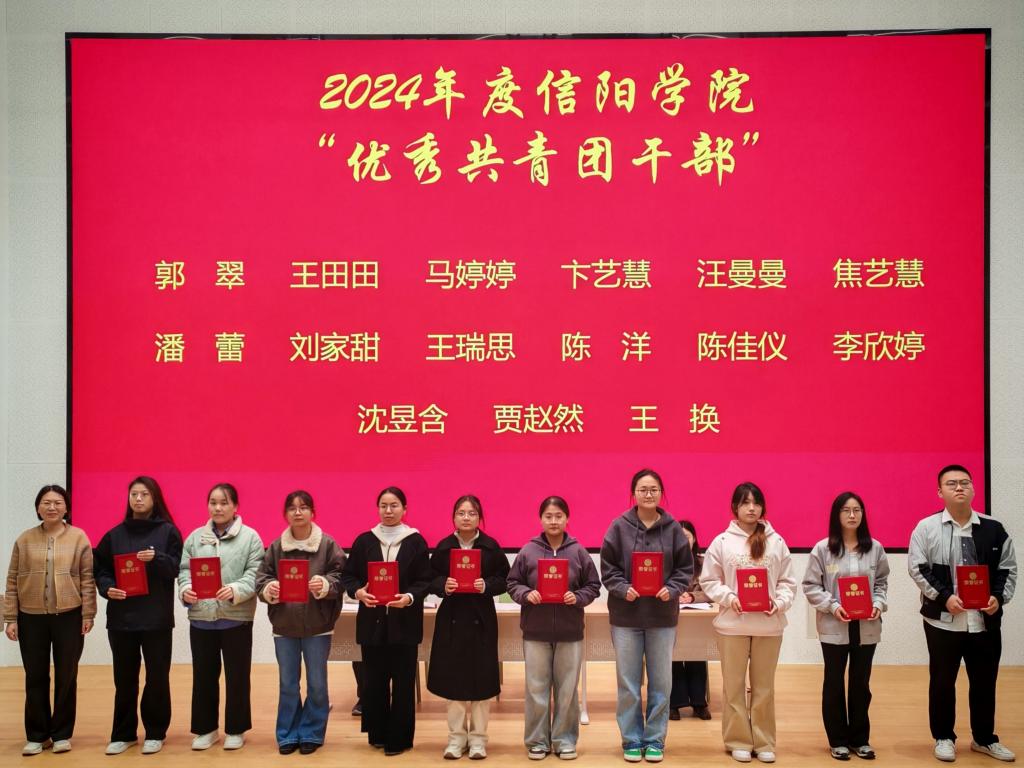 大会首先表彰了2025年迎新球类比赛“优秀组织班级”、2024—2025学年“团学工作先进个人”和“社团工作先进个人”及2024年度信阳学院“五四红旗团支部”“优秀共青团员”“优秀共青团干部”。党总支书记刘颖方等人为获奖集体和个人颁奖,激励全体团学干部再创佳绩。