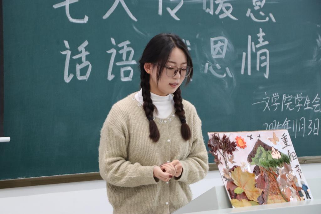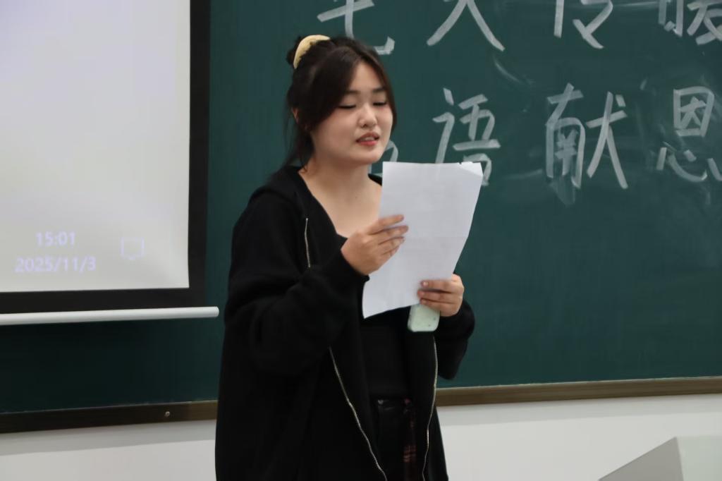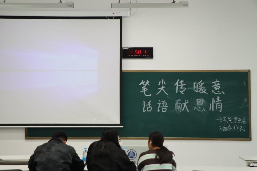 为提升学生道德修养,构建温情校园,11月6日下午,文学院于教一楼315、420教室举办“笔尖传暖意,话语献恩情”活动,此次活动面向全体文院学子展开,陈传秋、肖若菡、王欣然、刘铠诚、樊玥、秦羽琪担任活动评委,李梦涵、王慧婷为主持人。