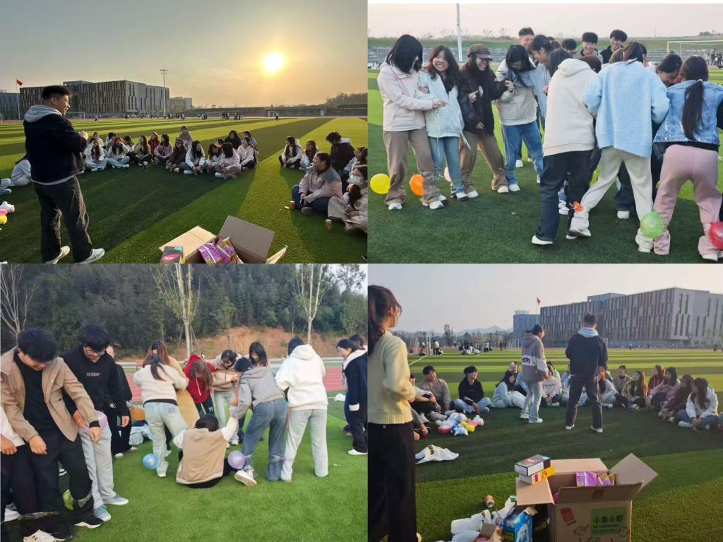 “同心协力踩气球”作为开场环节,迅速点燃了现场气氛。同学们在保护自己气球的同时,灵活出击、紧密配合,在协作中拉近了彼此距离。“桃花朵朵开”环节中,大家根据指令快速寻找同伴、组成对应“花团”,敏捷的反应和欢快的互动使得现场气氛持续升温。而在“压力爆破丢沙包”中,投手精准出击,防守方灵活闪避,彼此默契配合,欢呼声与笑语不绝于耳,压力也在奔跑与欢笑中悄然释放。
