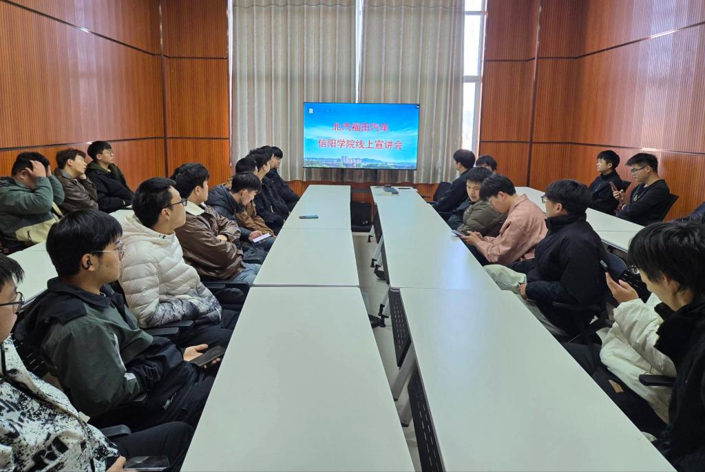 2025年11月20日上午,由理工学院汽车工程教研室组织的北汽福田汽车线上招聘宣讲会在实训中心111顺利举行。此次宣讲会由汽车工程教研室主任王思满老师对接、汽车工程教研室教师黄孟辉老师主持,车辆工程与机械电子工程两个专业的毕业班学生代表共计四十余名同学参与,现场与企业负责人进行了深入的交流与互动。