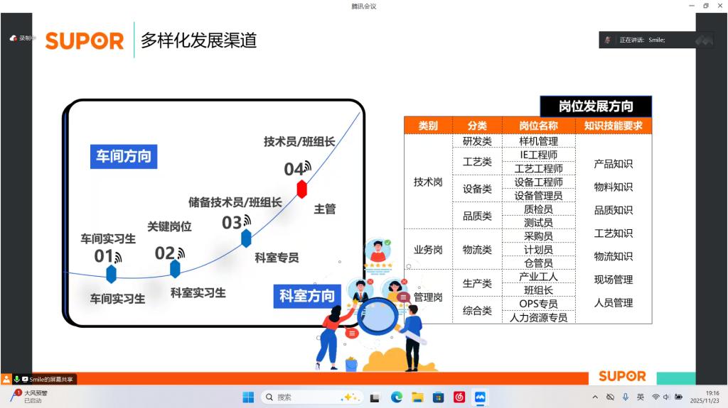宣讲会上,苏泊尔家电制造有限公司龚经理通过企业宣传片、PPT演示等丰富形式,全方位展现了公司的发展历程、行业地位、核心业务及未来战略布局。针对毕业生关注的重点,龚经理详细介绍了公司的职业发展体系、人才培养计划、岗位需求方向及薪酬福利政策、培训机制等关键信息,让同学们对企业及招聘岗位有了清晰认知。