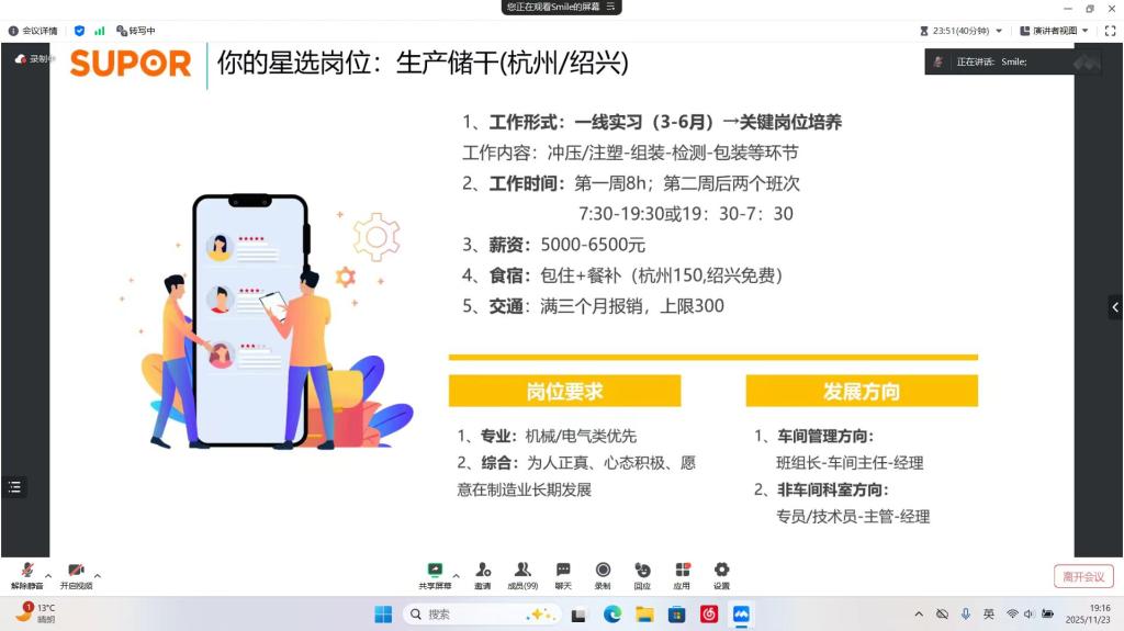 为进一步拓宽毕业生就业渠道,搭建校企人才供需对接平台,助力学子实现高质量就业,11月24日晚,理工学院联合浙江苏泊尔家电制造有限公司举办线上招聘宣讲会。本次宣讲会由学院辅导员田亚星主持,吸引了机械电子工程专业百余名应届毕业生云端参会,互动交流氛围热烈,现场互动踊跃。