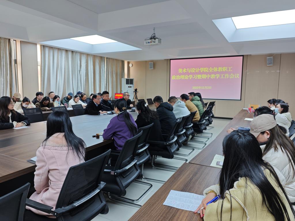 12月2日下午,美术与设计学院在艺术楼215会议室召开全体教职工政治理论学习暨期中教学工作会。党总支书记郑山峰、教学副院长王伟及全体教师参加了会议。会议由郑山峰主持。