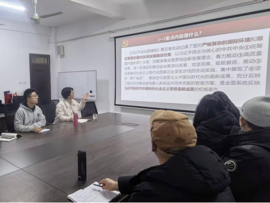 思想领航,实践同行。为推动《习近平谈治国理政》第五卷学习走深走实,12月2日下午,形势与政策教研室联合向阳新思想宣讲团,在人文楼南楼412会议室共同举办专题读书会。院党总支书记陈金强、李达理博士、郭世杰博士、形势与政策课全体任课教师及向阳新思想宣讲团学生代表参加本次学习活动,共学共进。读书活动由刘惠文主持。